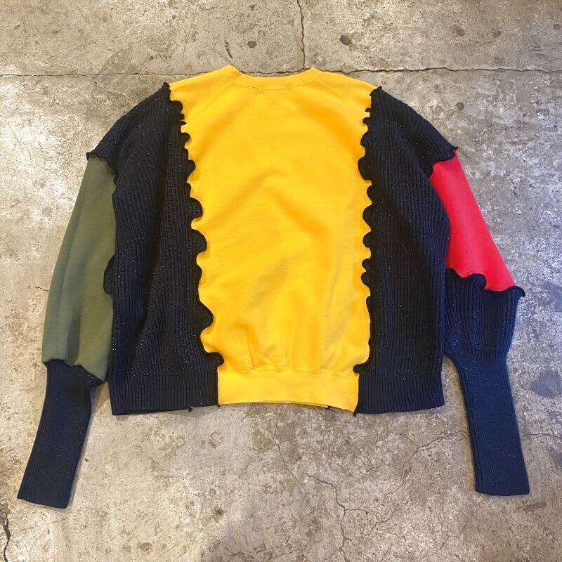 異なる素材のニットやスウェットがアートな印象の1枚に。