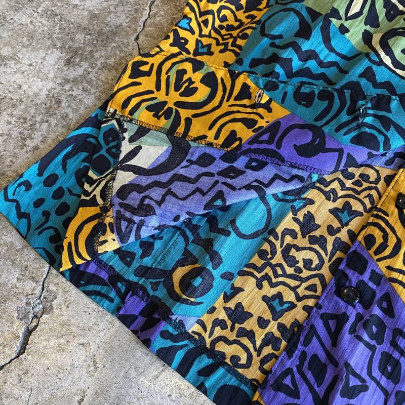 インパクトのある総柄のデザイントップス。