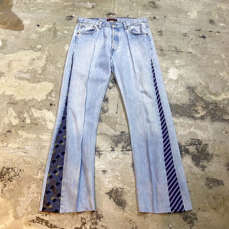 デニムとネクタイを解体・再構築し、新たなシルエットとデザインを生み出したSIDE TIE LINE DENIM PANTS。
