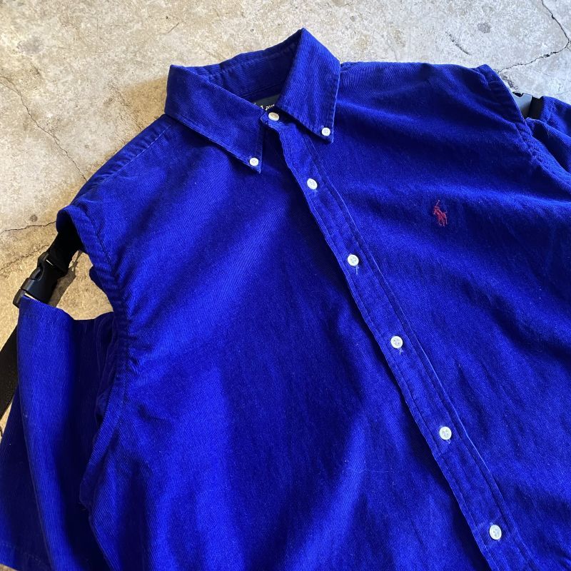 ラルフローレンのシャツにカットオフとベルトを施し、スリーブに変化を与えたディテール。
