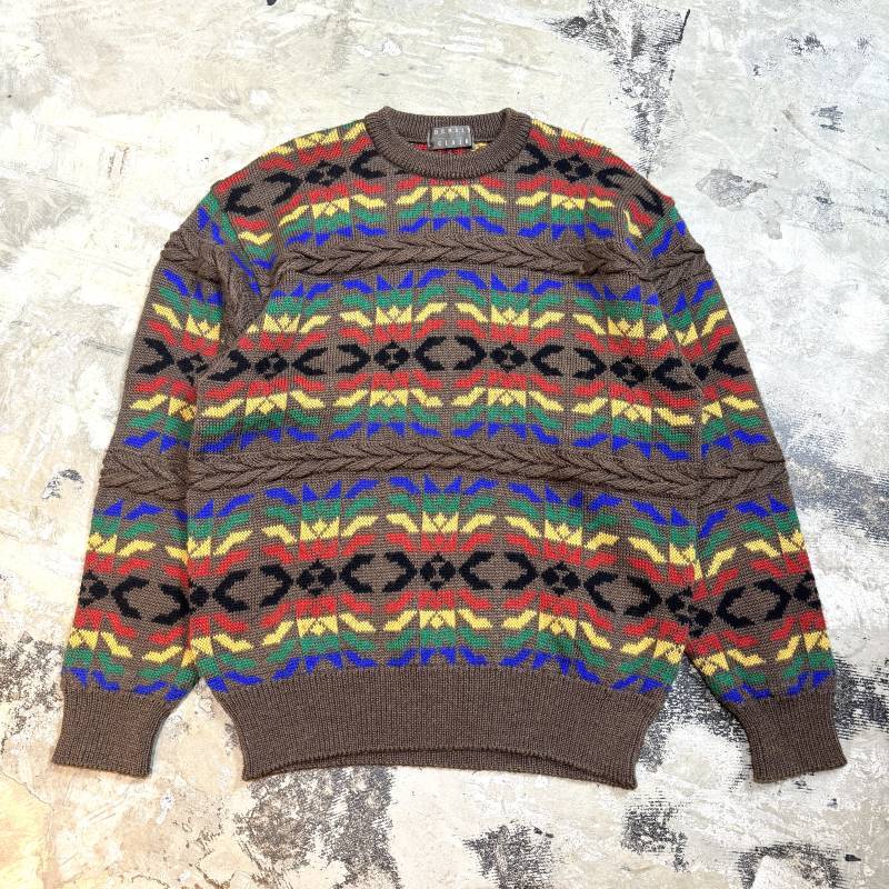カラフルなネイティブ調の柄が施された、デザインニットセーター。