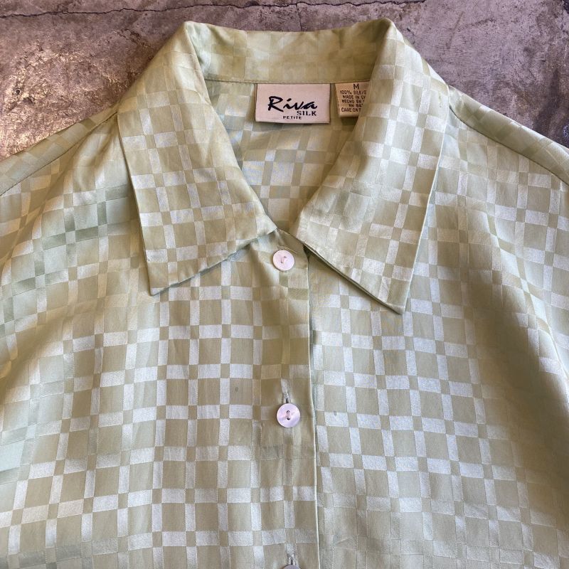 PISTACHIO GREEN COLOR CHECKERS DESIGN SILK L/S SHIRT / Ladies M (L)