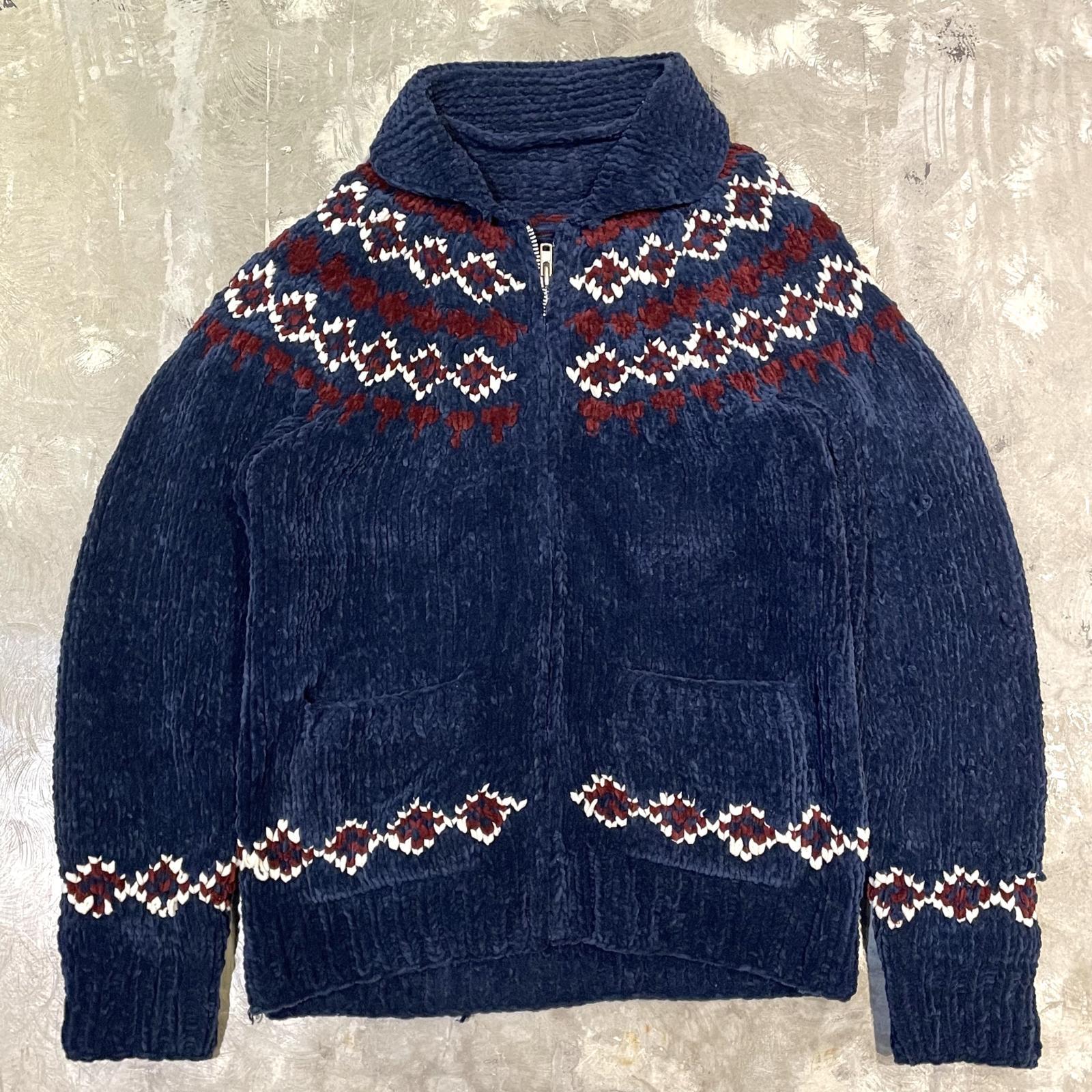 NATIVE PATTERN ZIP UP CHENILL KNIT JACKET / Mens L