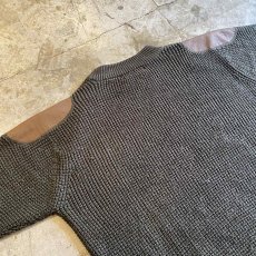 カーキのシンプルなニットにショルダーにレザーパッチが仕様されたデザイン。