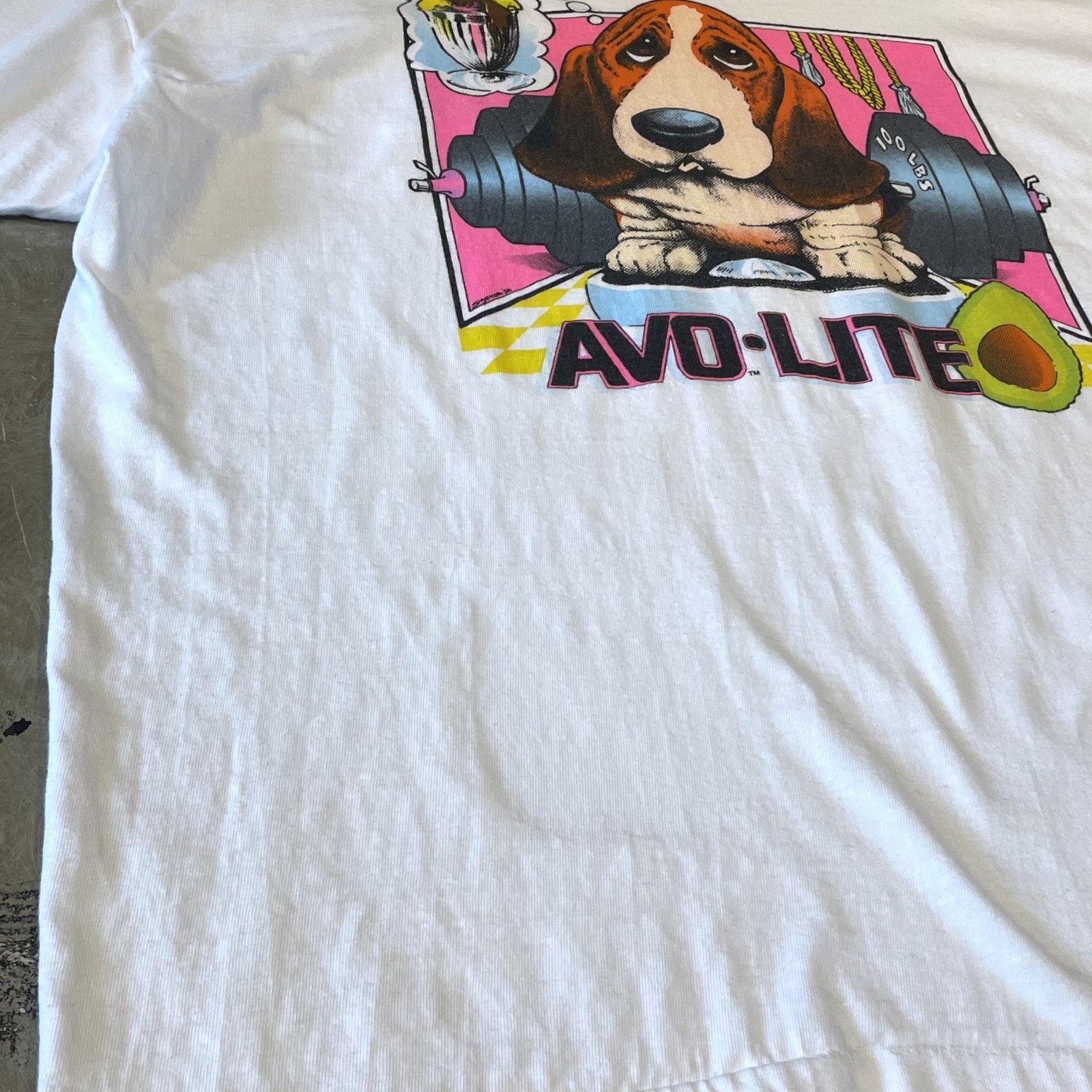 この企業が肥満体型の犬用に開発した"AVO-LITE"がキュートな犬と共にプリントされた、1990年代のヴィンテージ半袖Tシャツ。