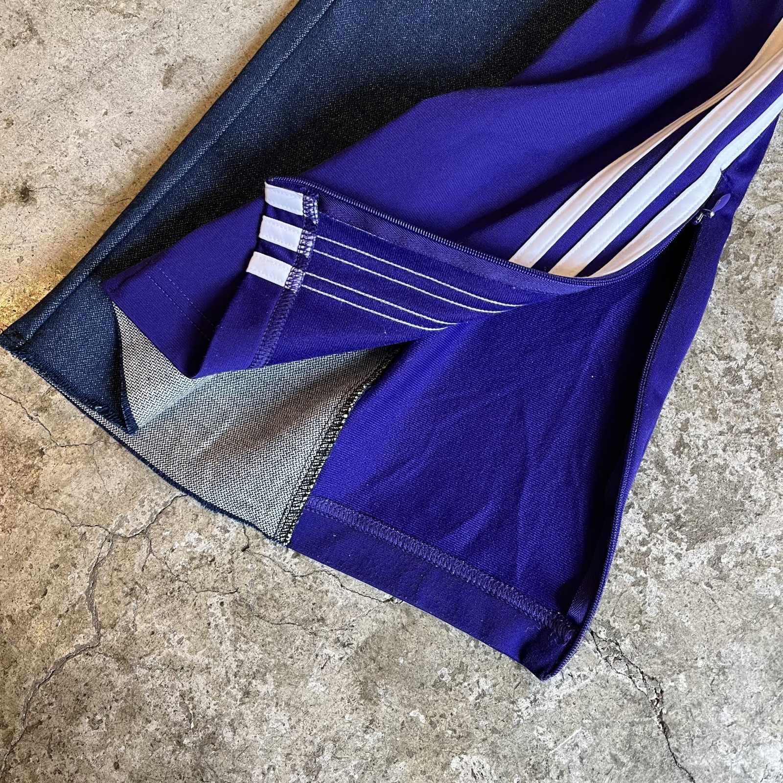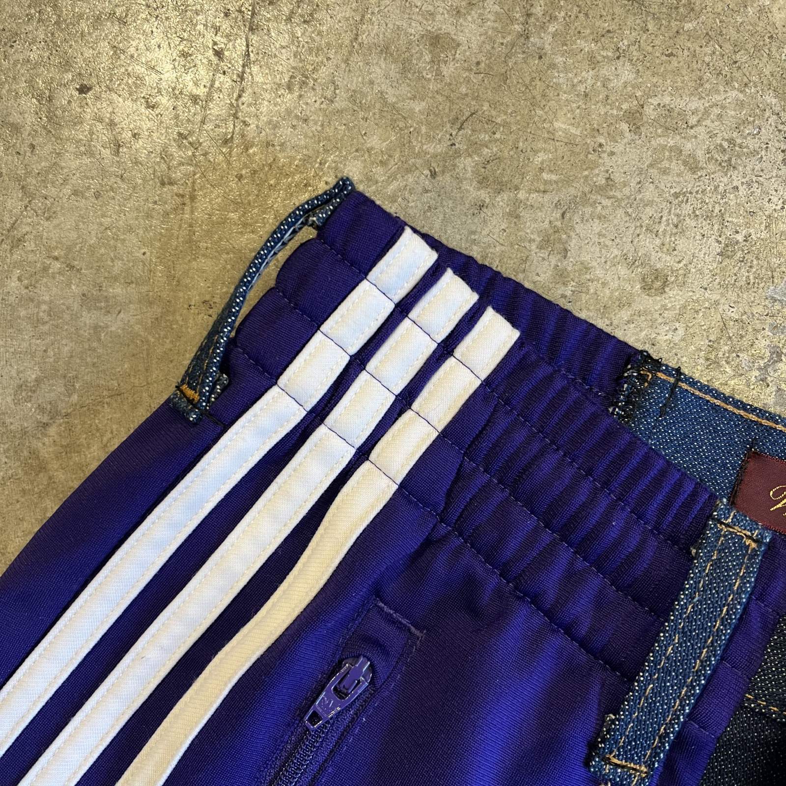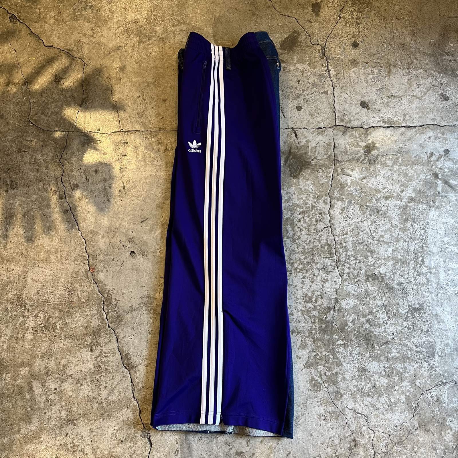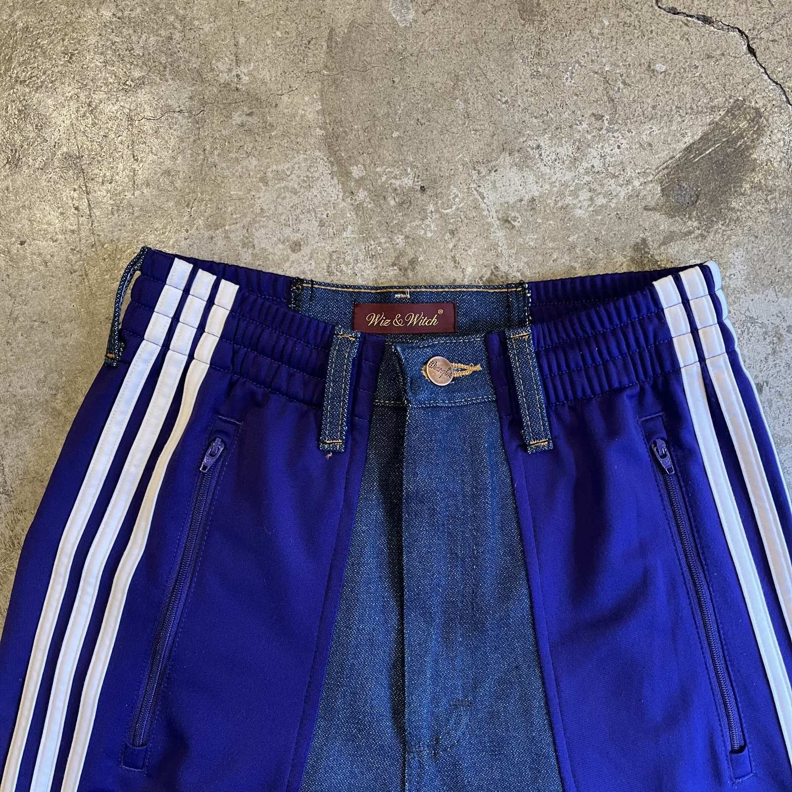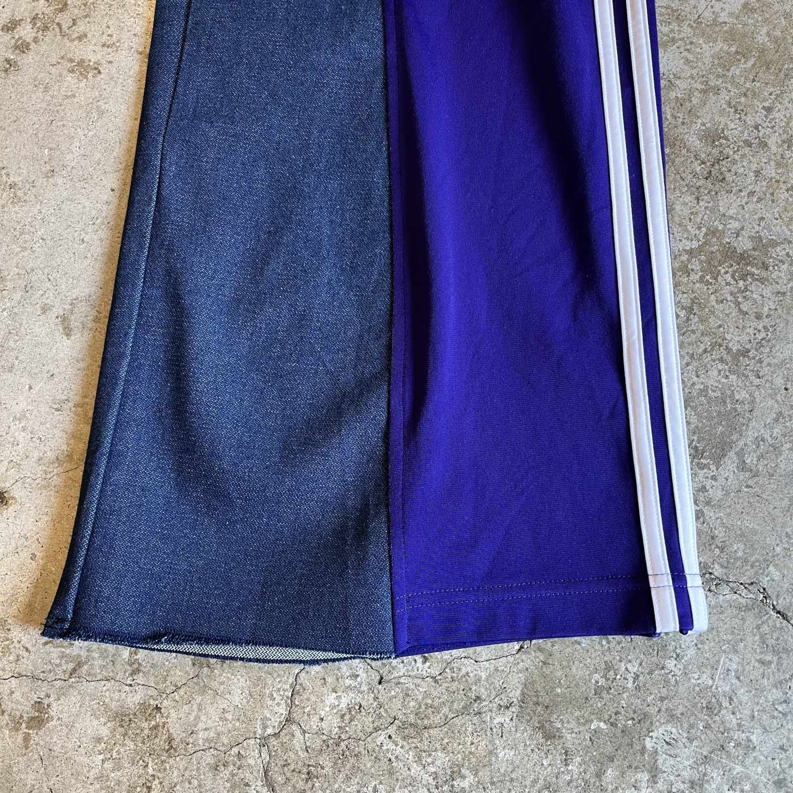 "adidas"のトラックパンツとデニムパンツをドッキングした1本。