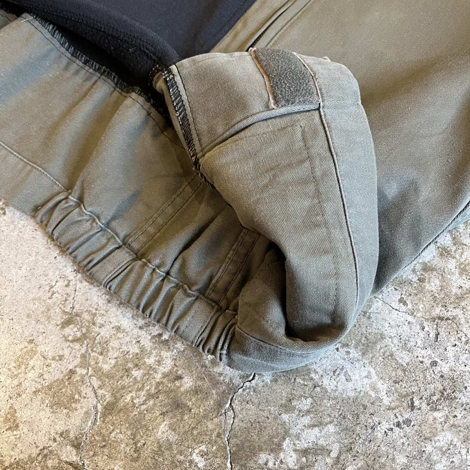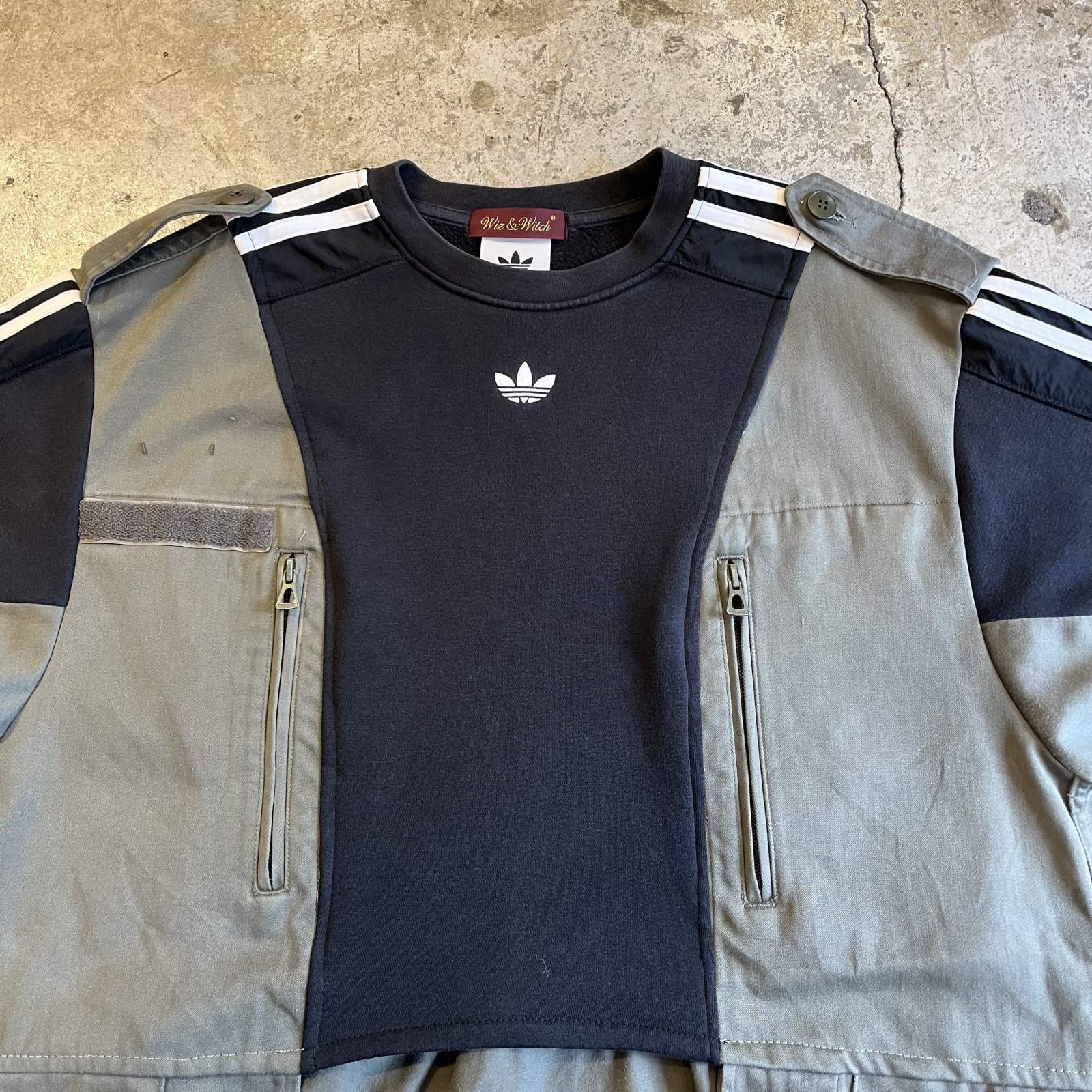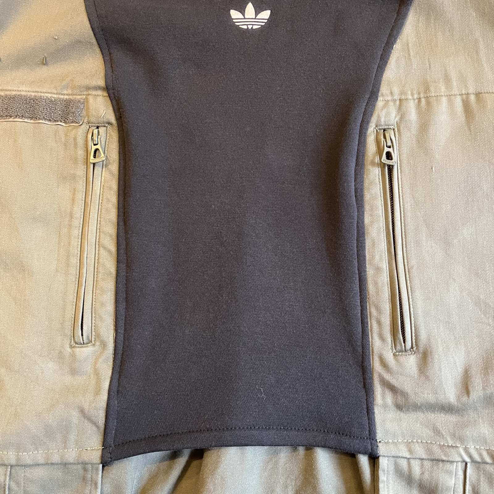 スポーツブランドのadidasのスウェットにミリタリージャケットをドッキング。