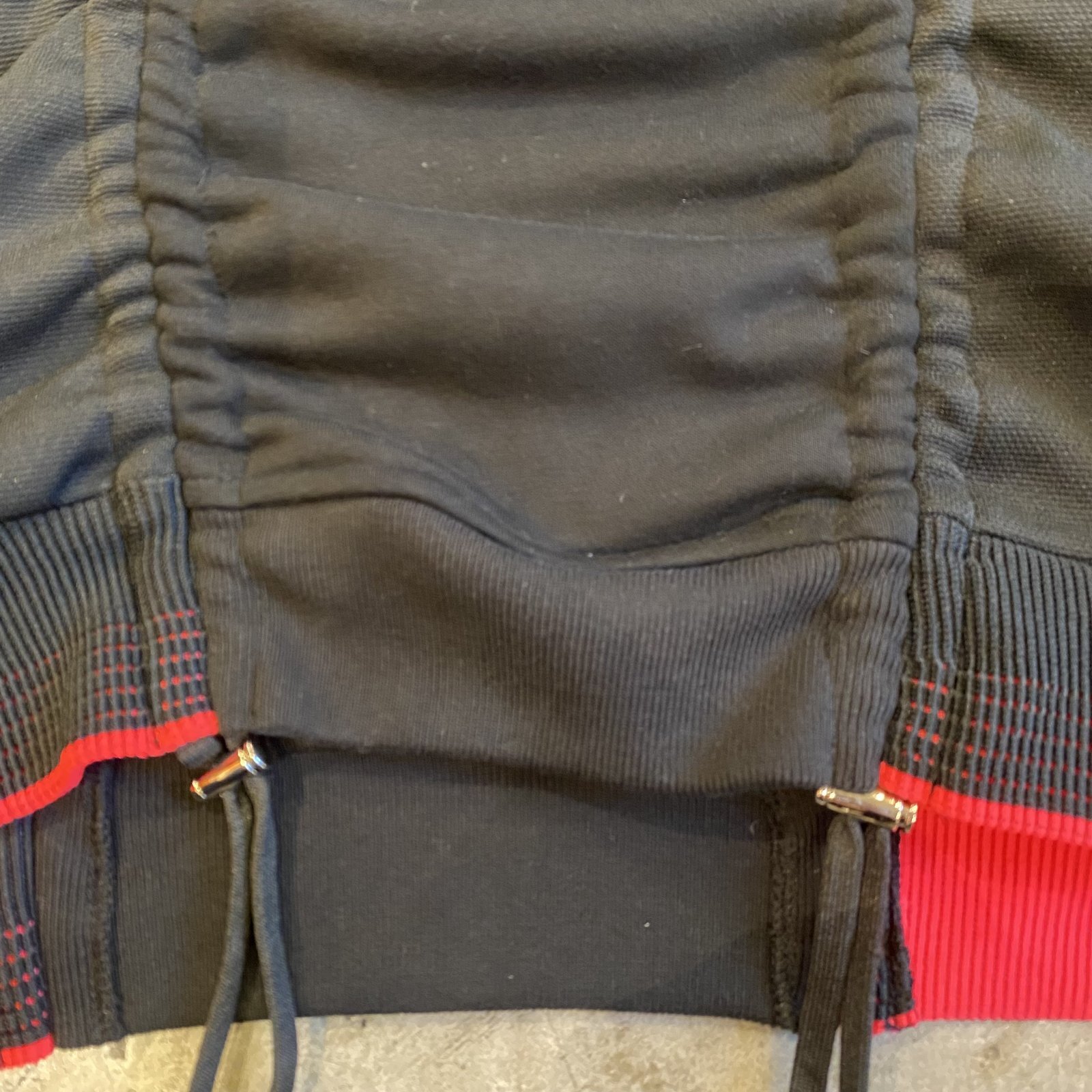 フロントにドローコードがついており絞り具合で着丈やシルエットの変化ができデザイナーの拘りが詰まったアイテム。