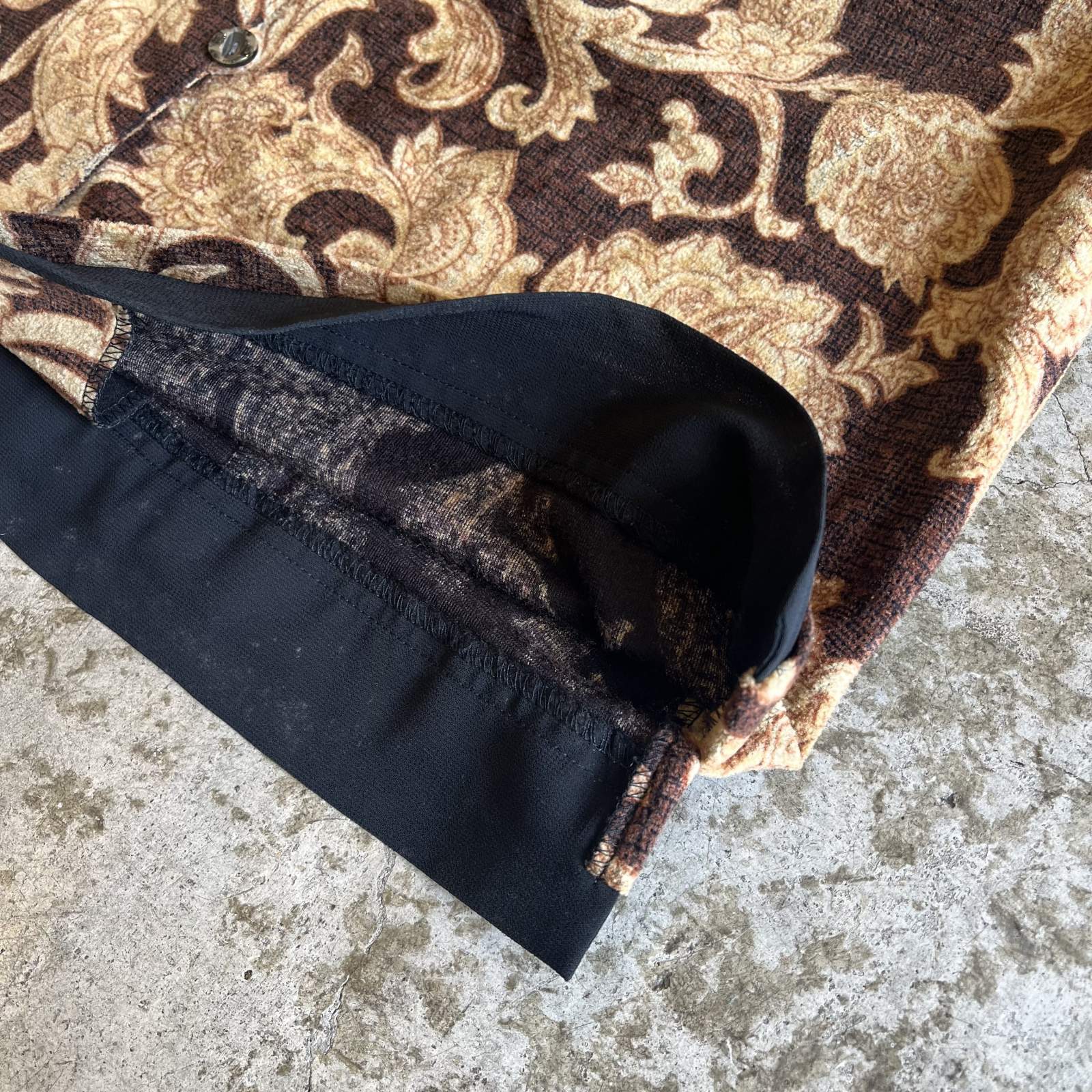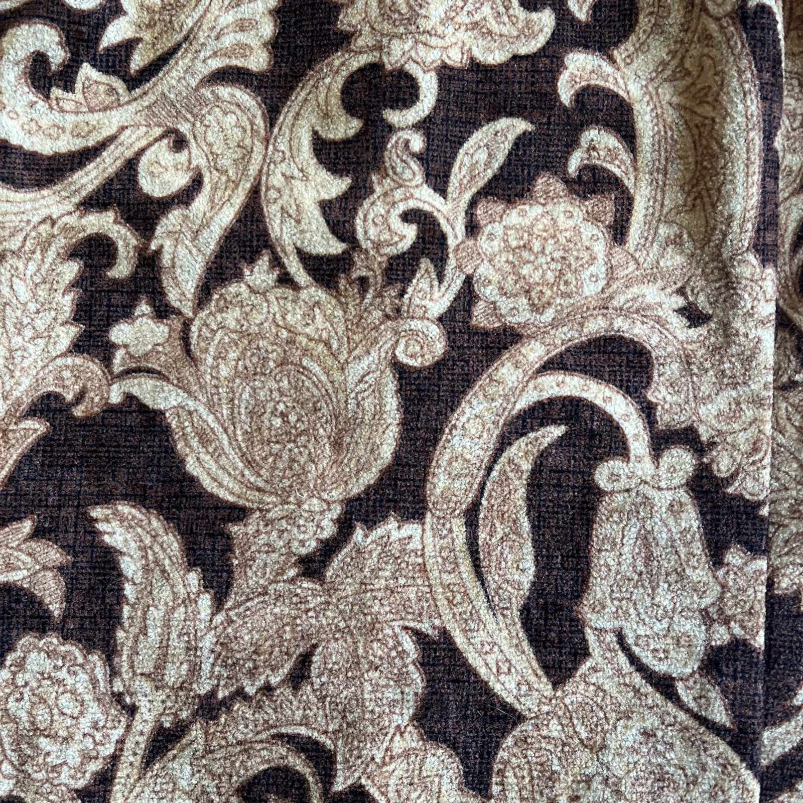 落ち着いたブラウンベースにペイズリーのようなアート模様が散りばめられた1枚。
