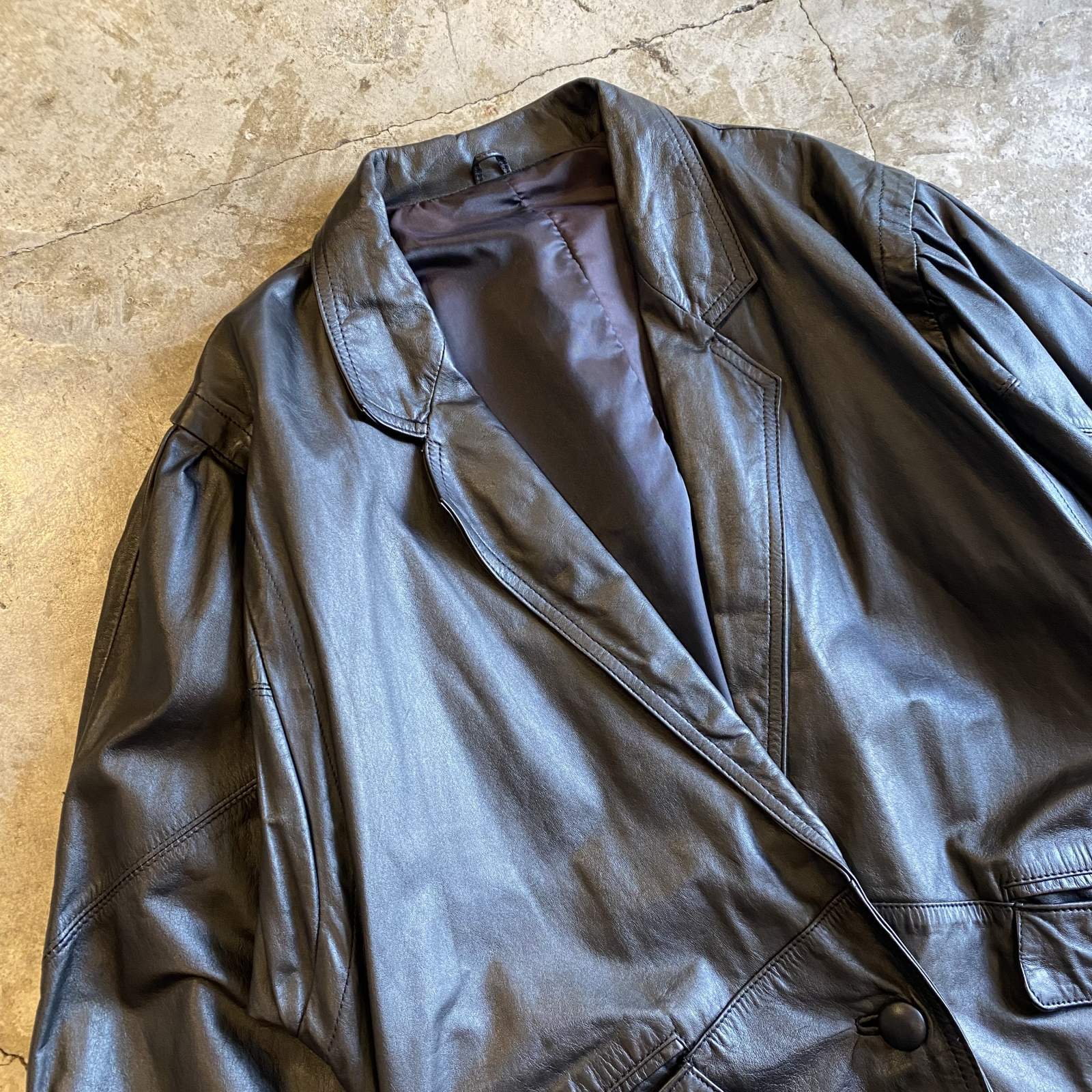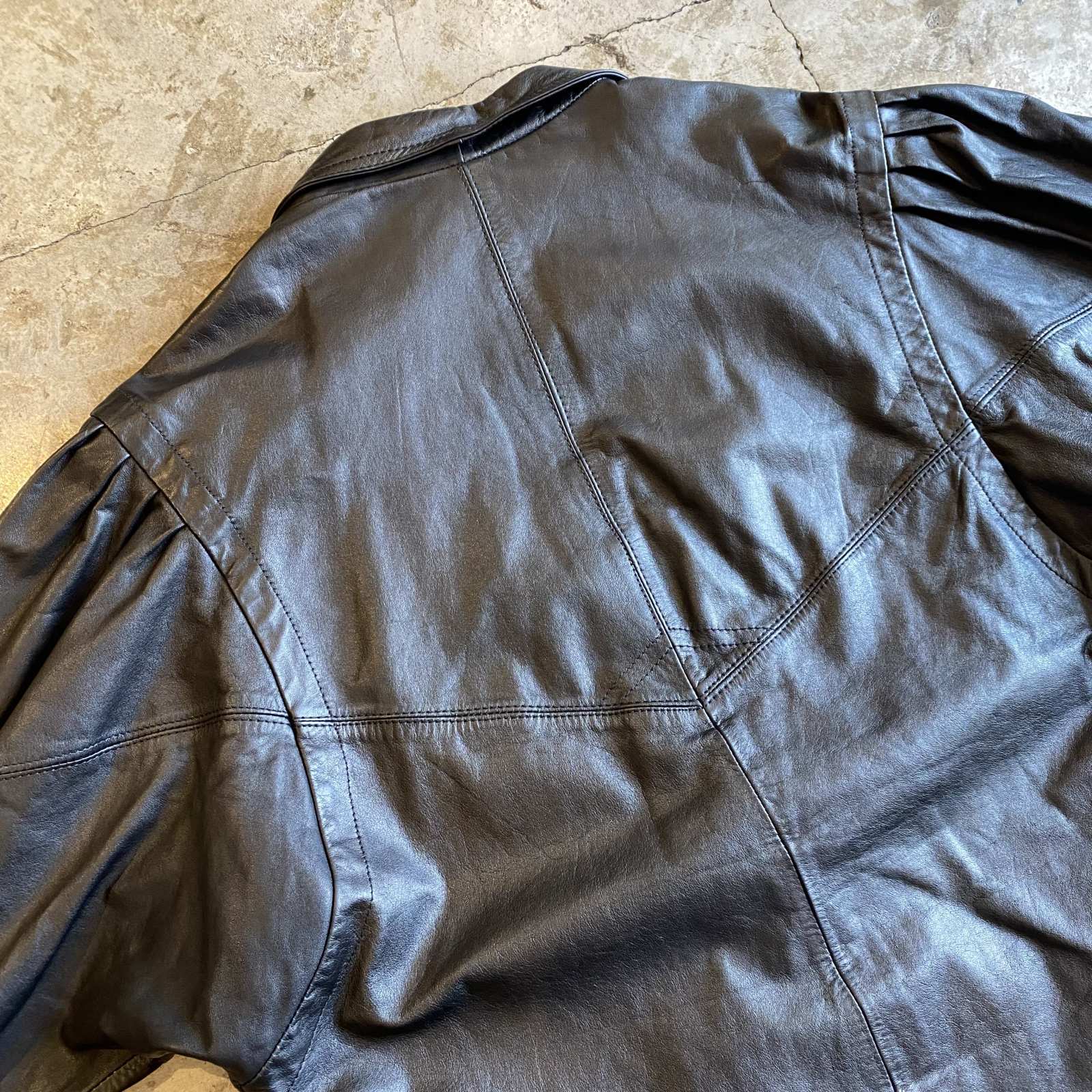 BLACK COLOR SHOULDER GATHER DESIGN LEATHER TAILORED JACKET / Ladies M~L