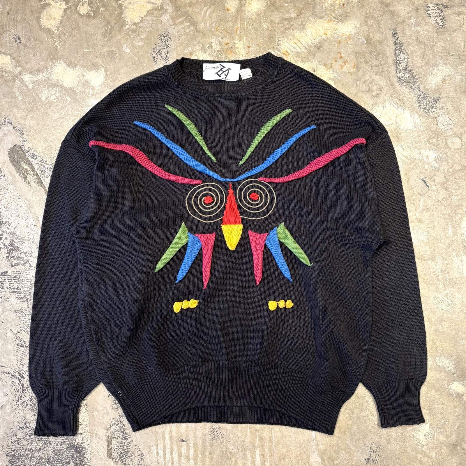 フロントにフクロウのようなデザインが立体的に施された、デザインニットセーター。