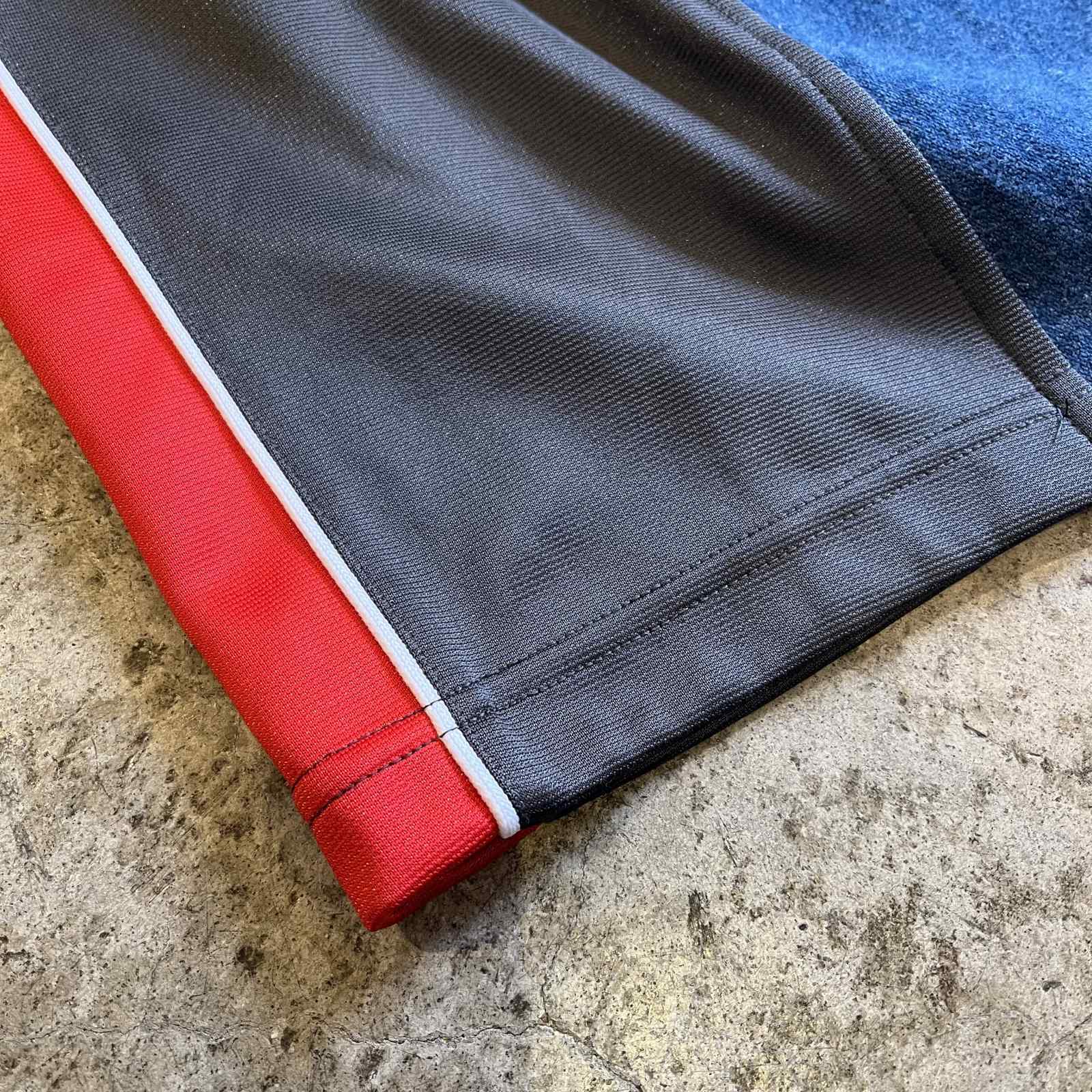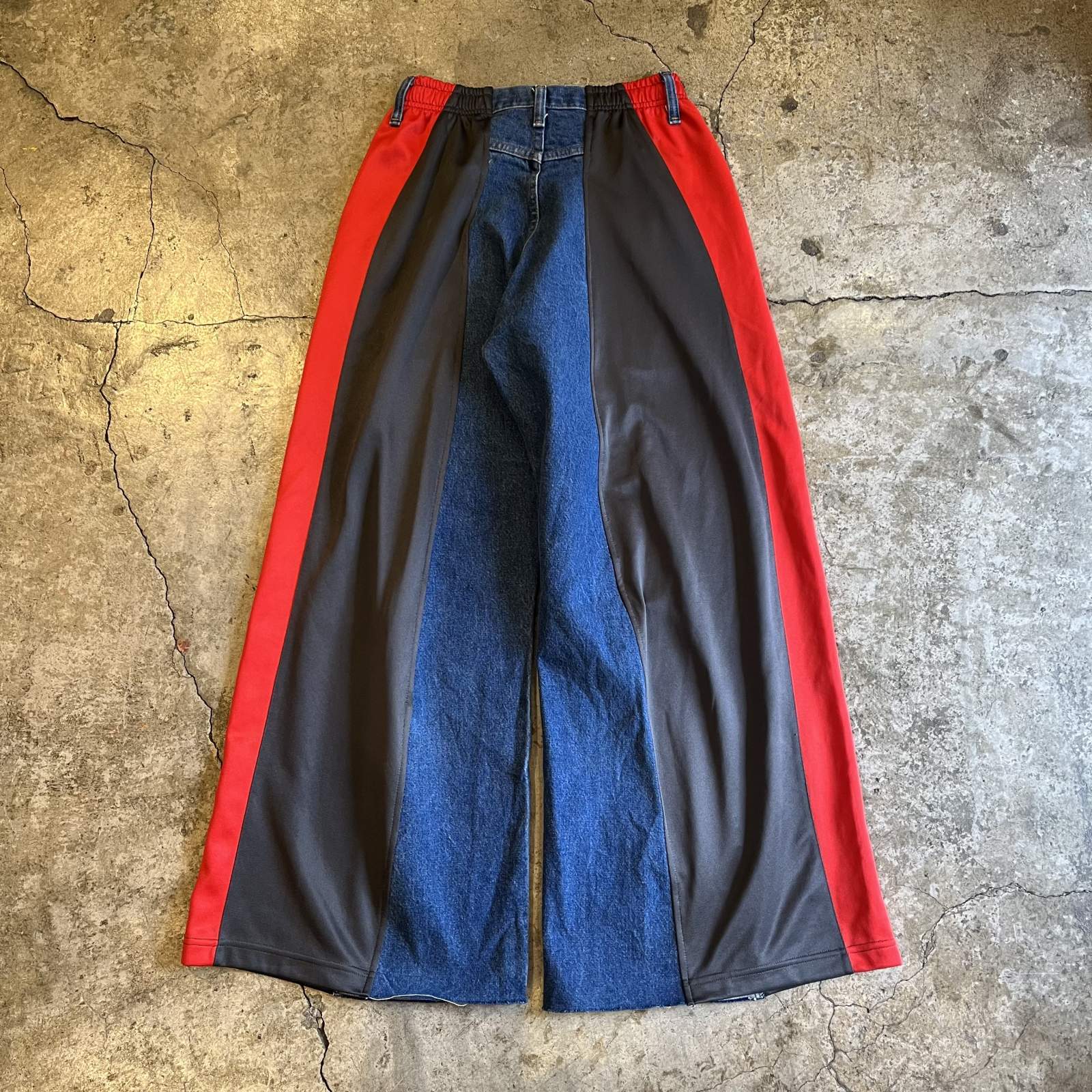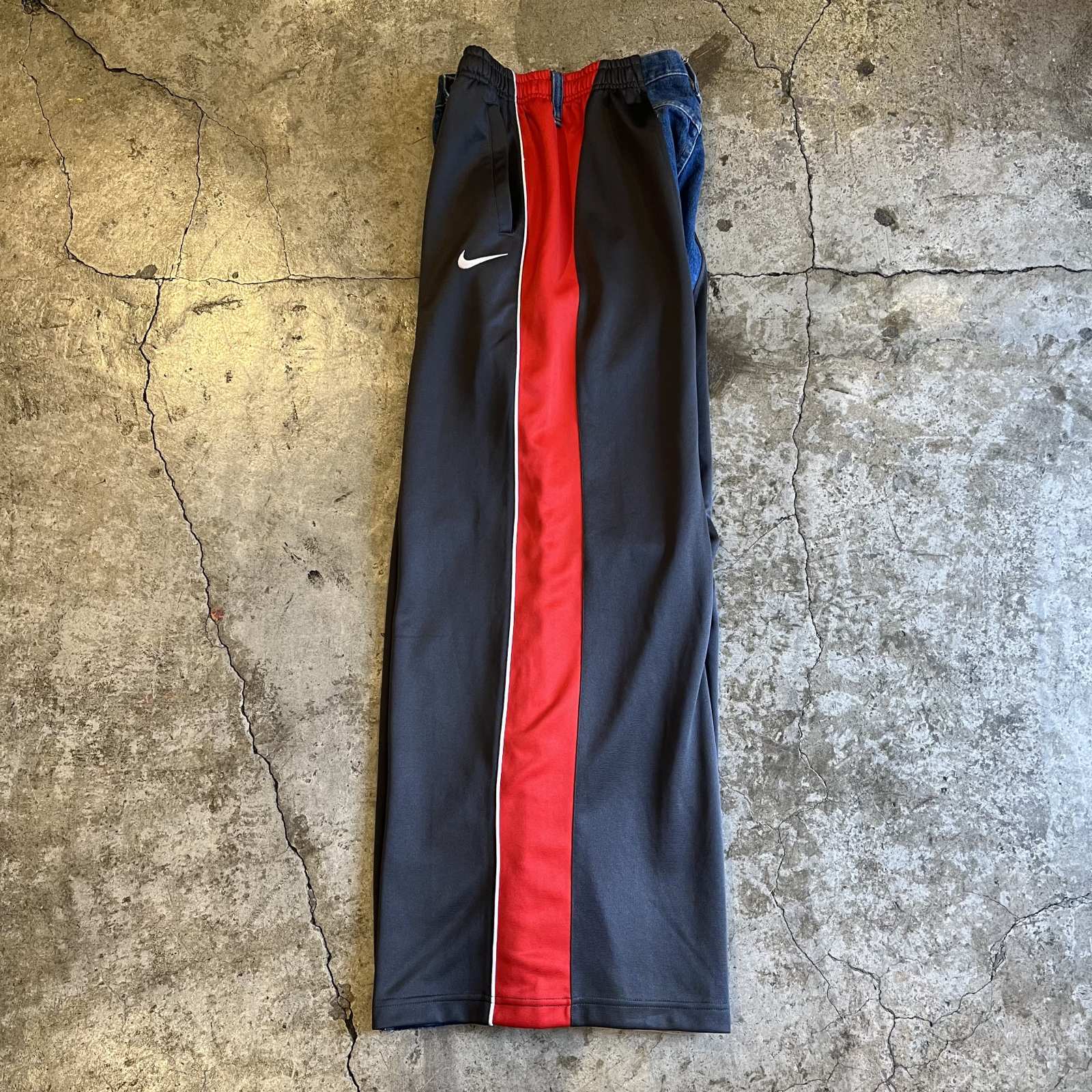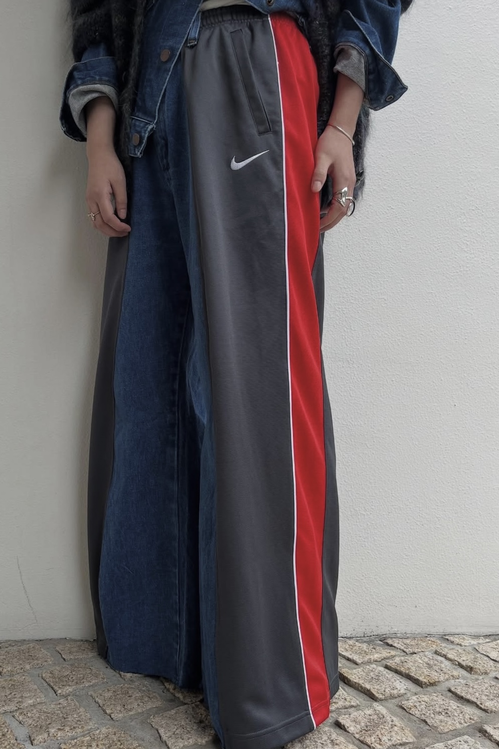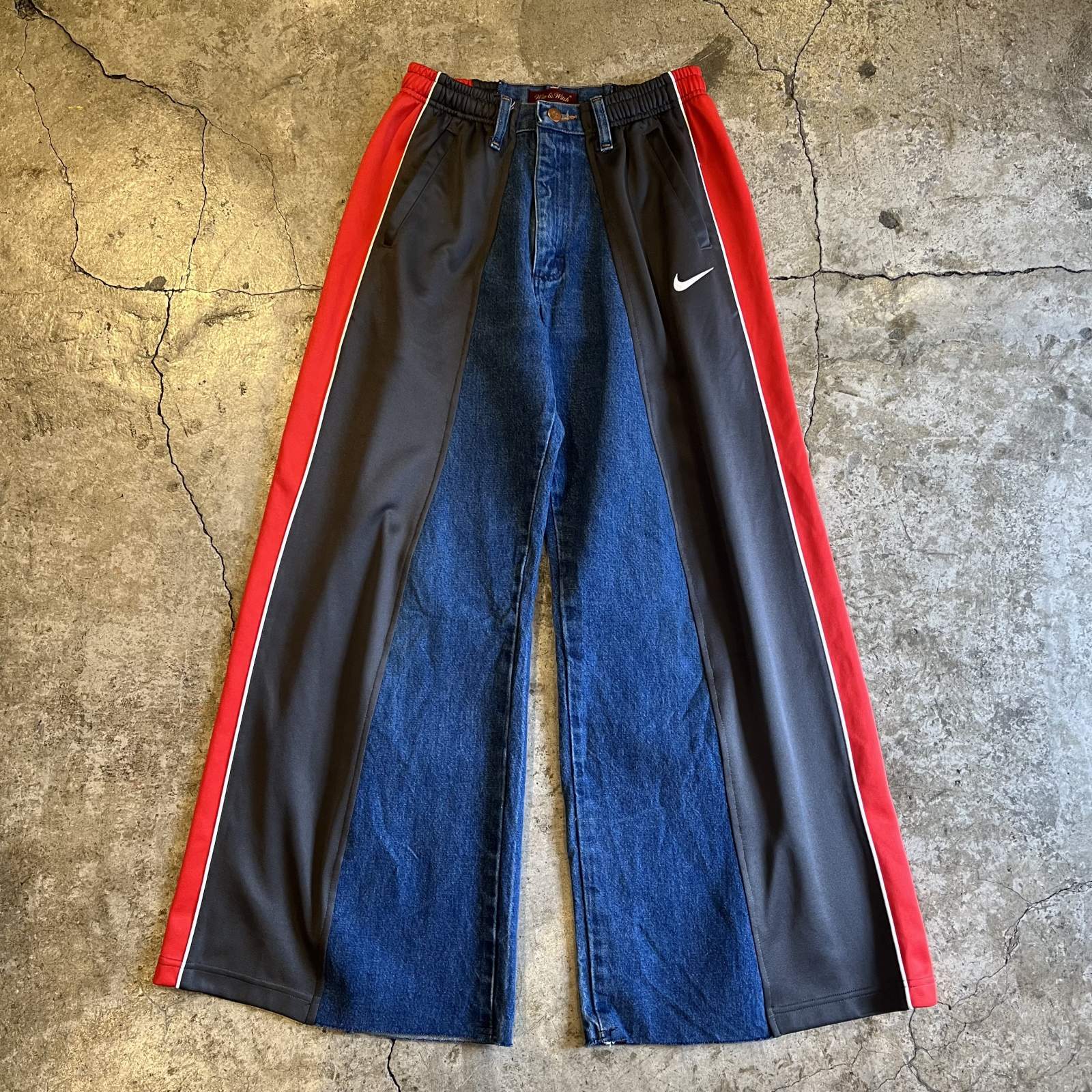 "NIKE"のトラックパンツとデニムパンツをドッキングした1本。