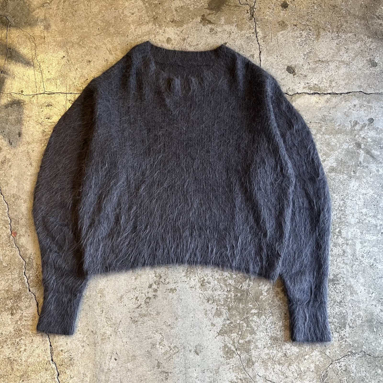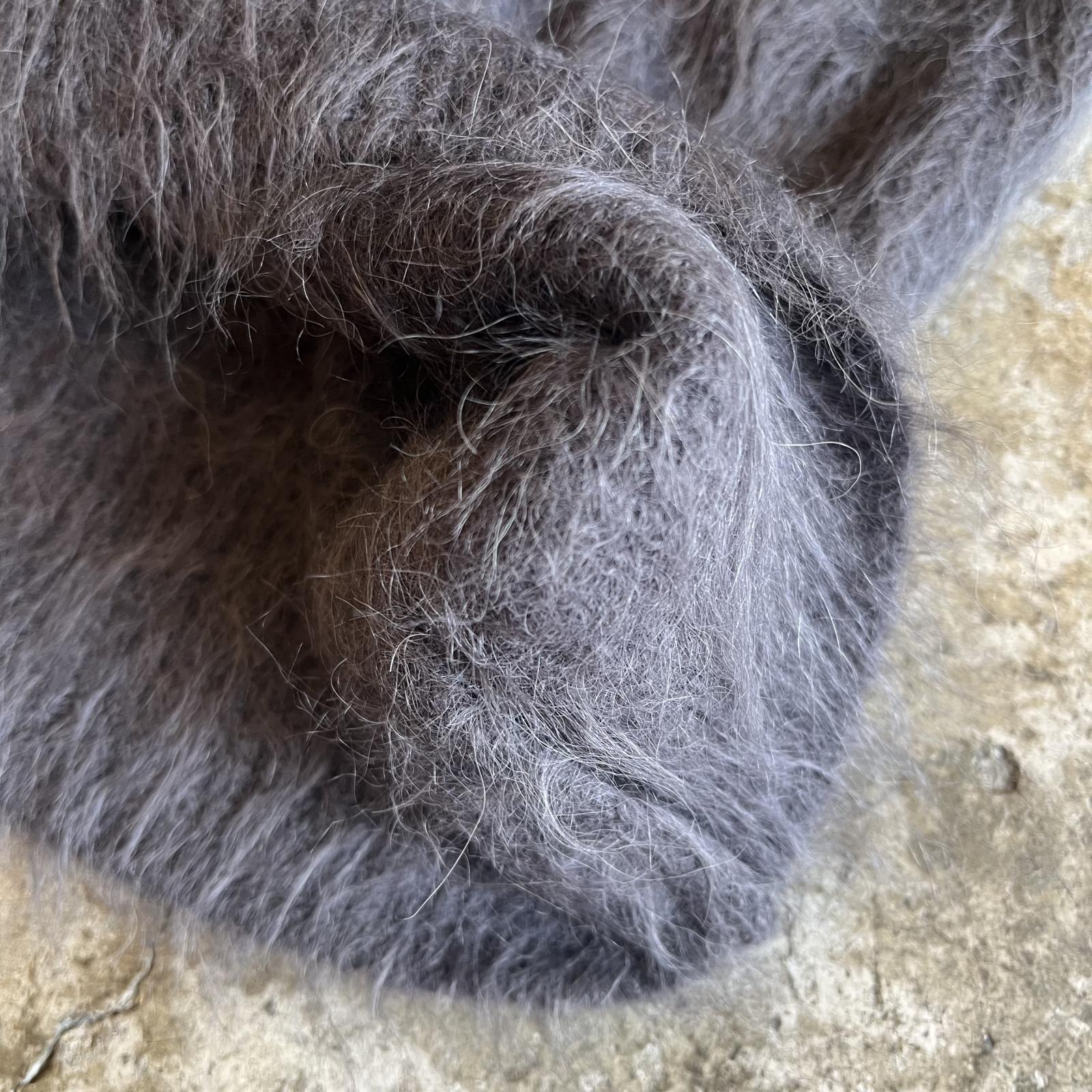 落ち着いたカラーリングのデザインニット。 ペールトーンのグレーカラーが大人の雰囲気を纏った1枚。 モヘアのような毛足の長いボディが高級感と上品さを併せ持ったアイテム。 裾のキュッと締まったシル…