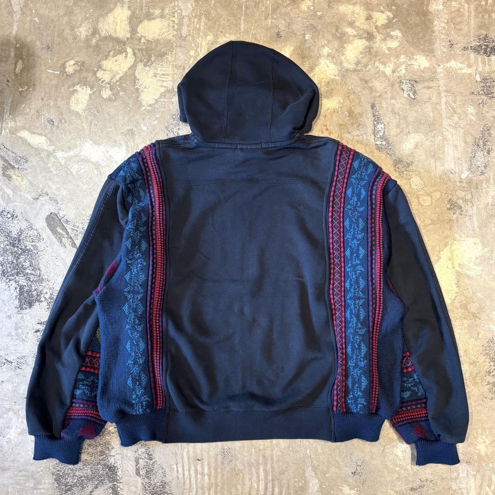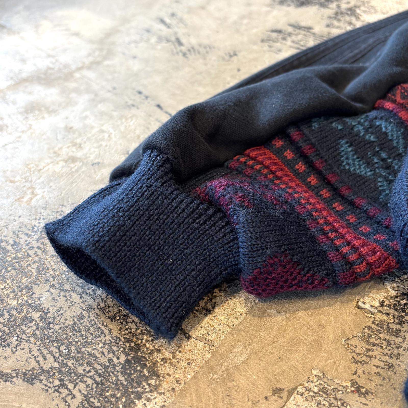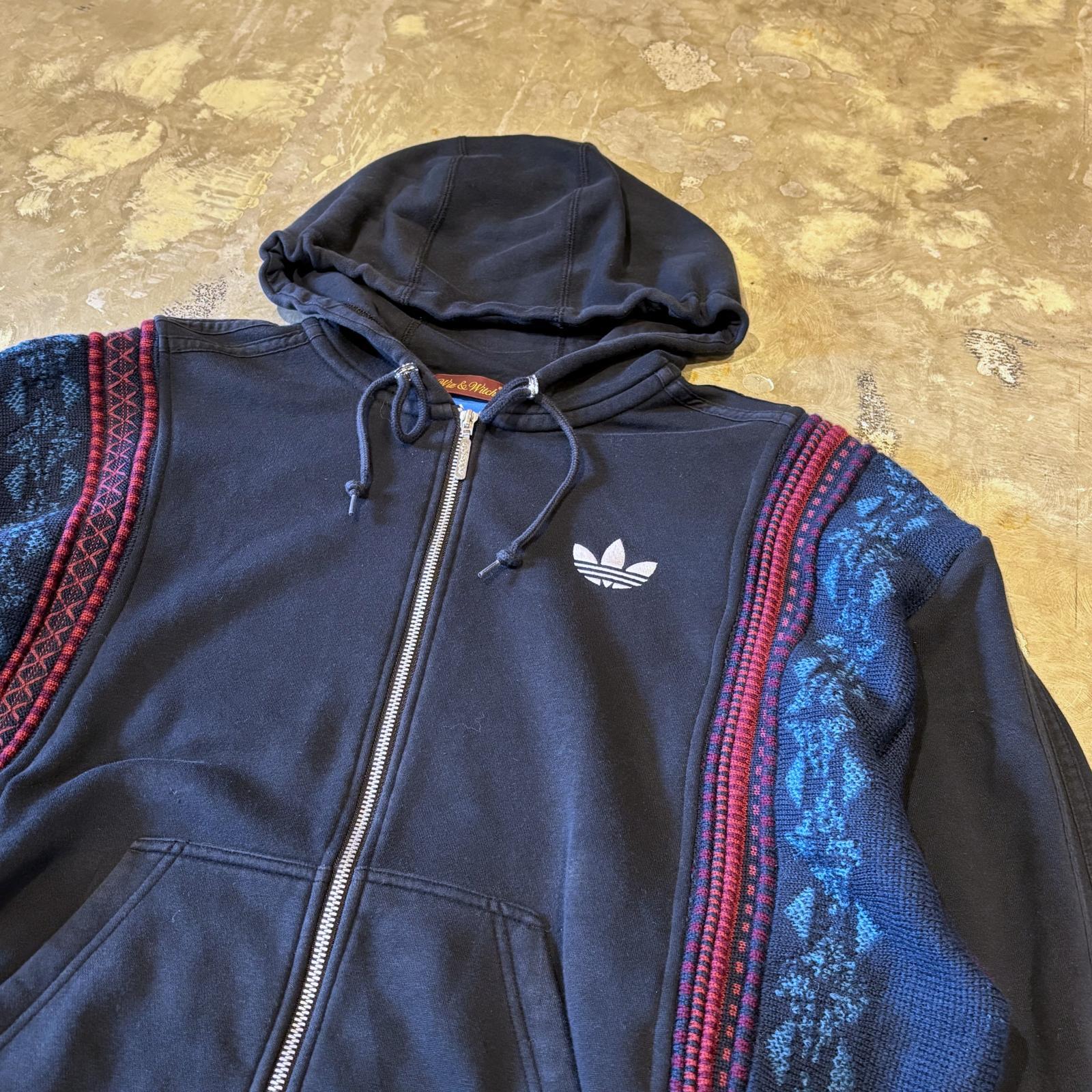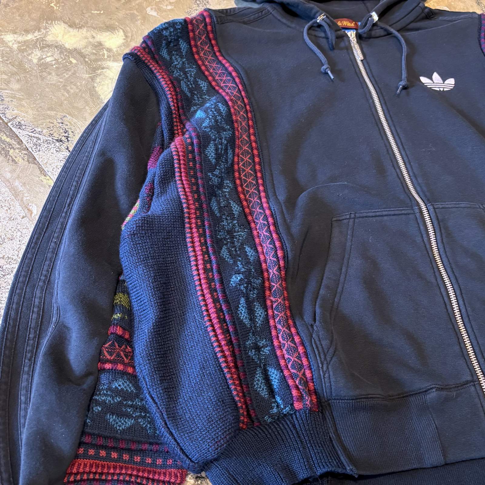 総柄のニットセーターとadidasのジップパーカーをドッキングした1枚。