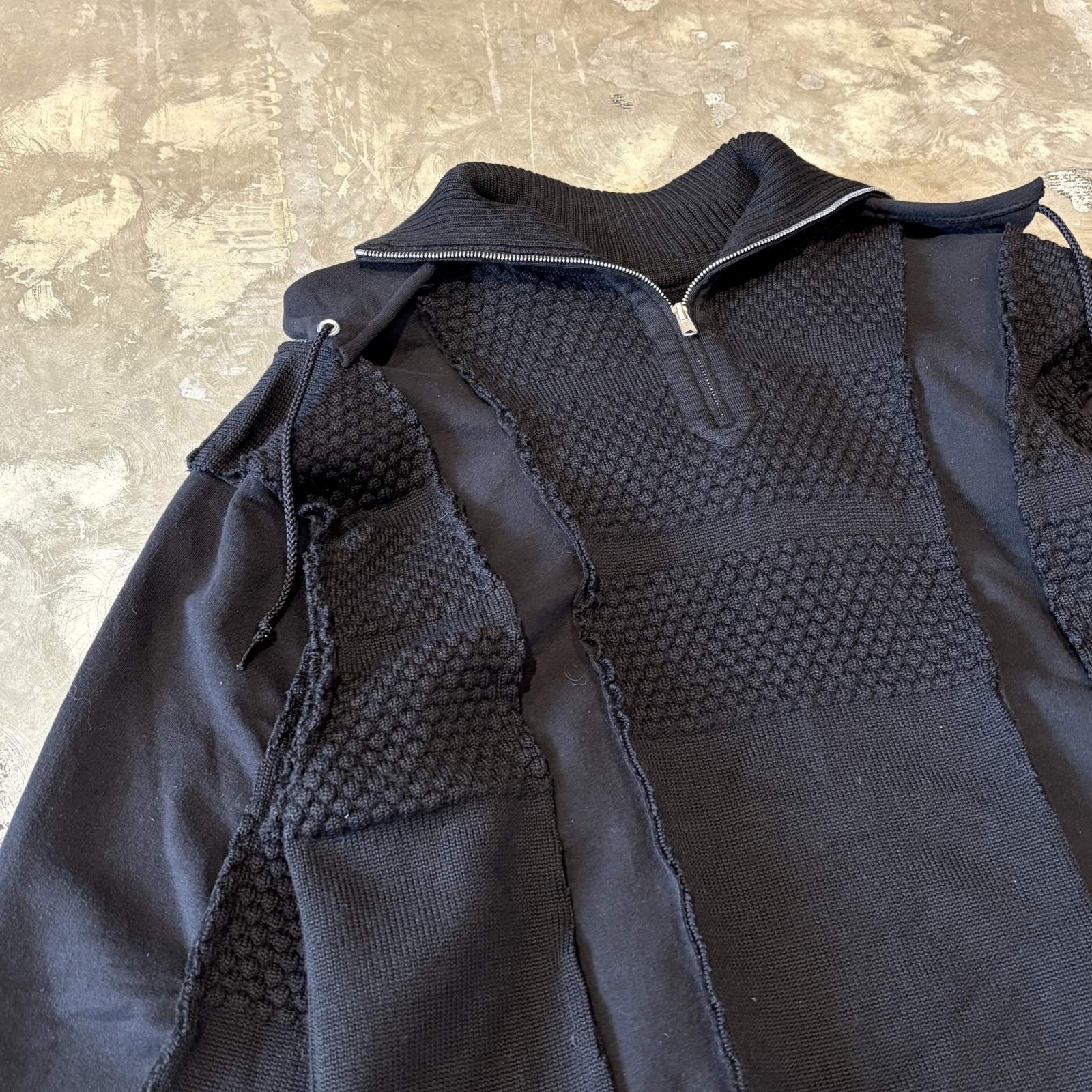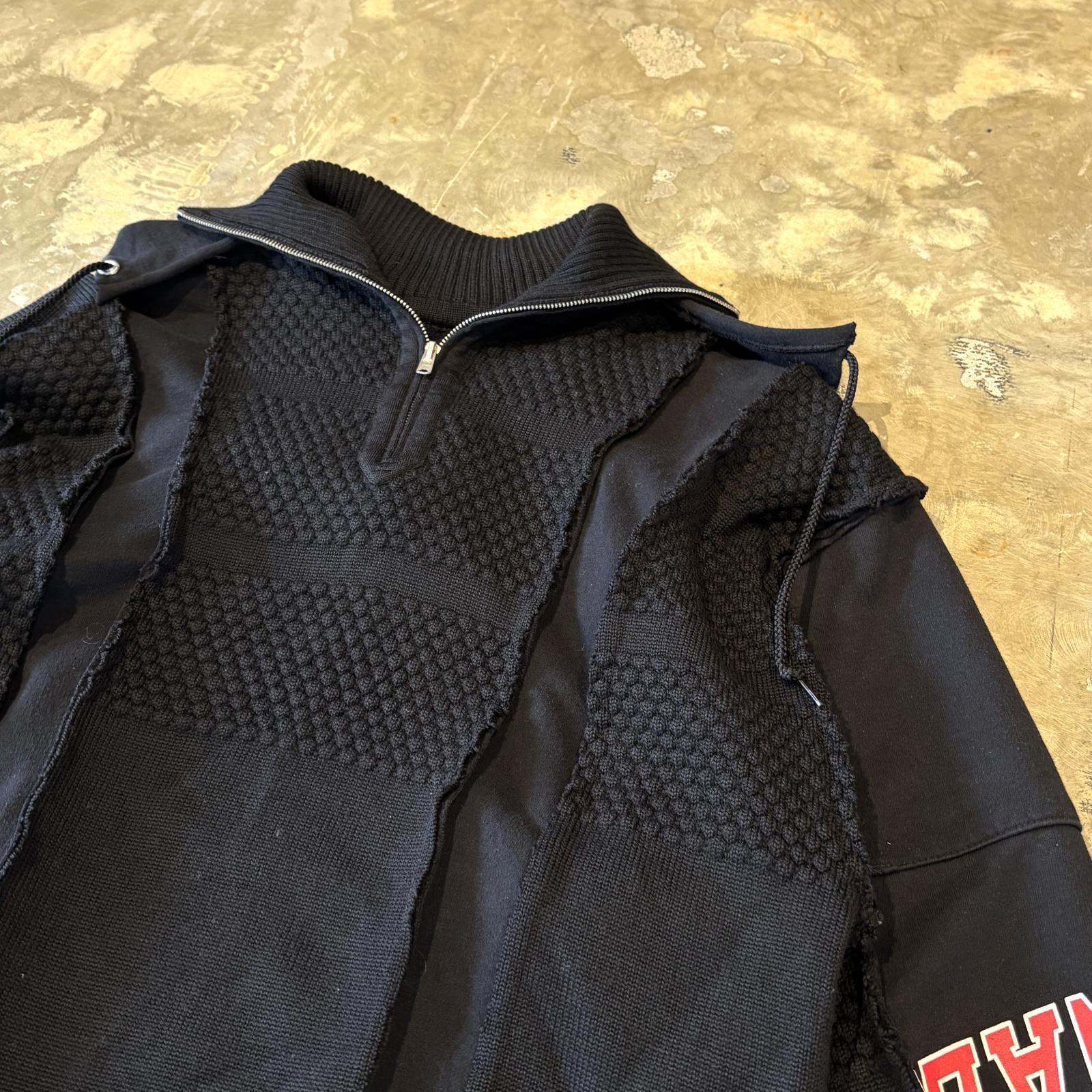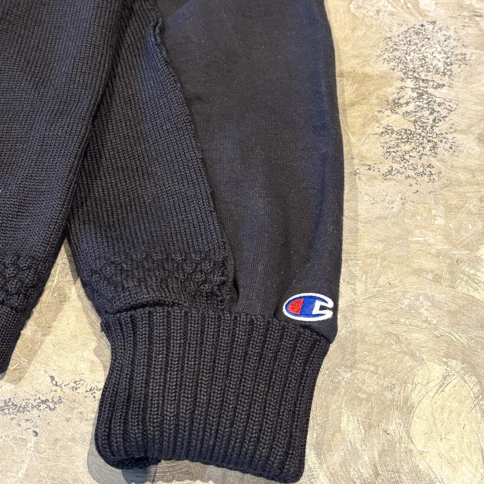 ハーフジップニットセーターとchampionのカレッジスウェットをドッキングした1枚。