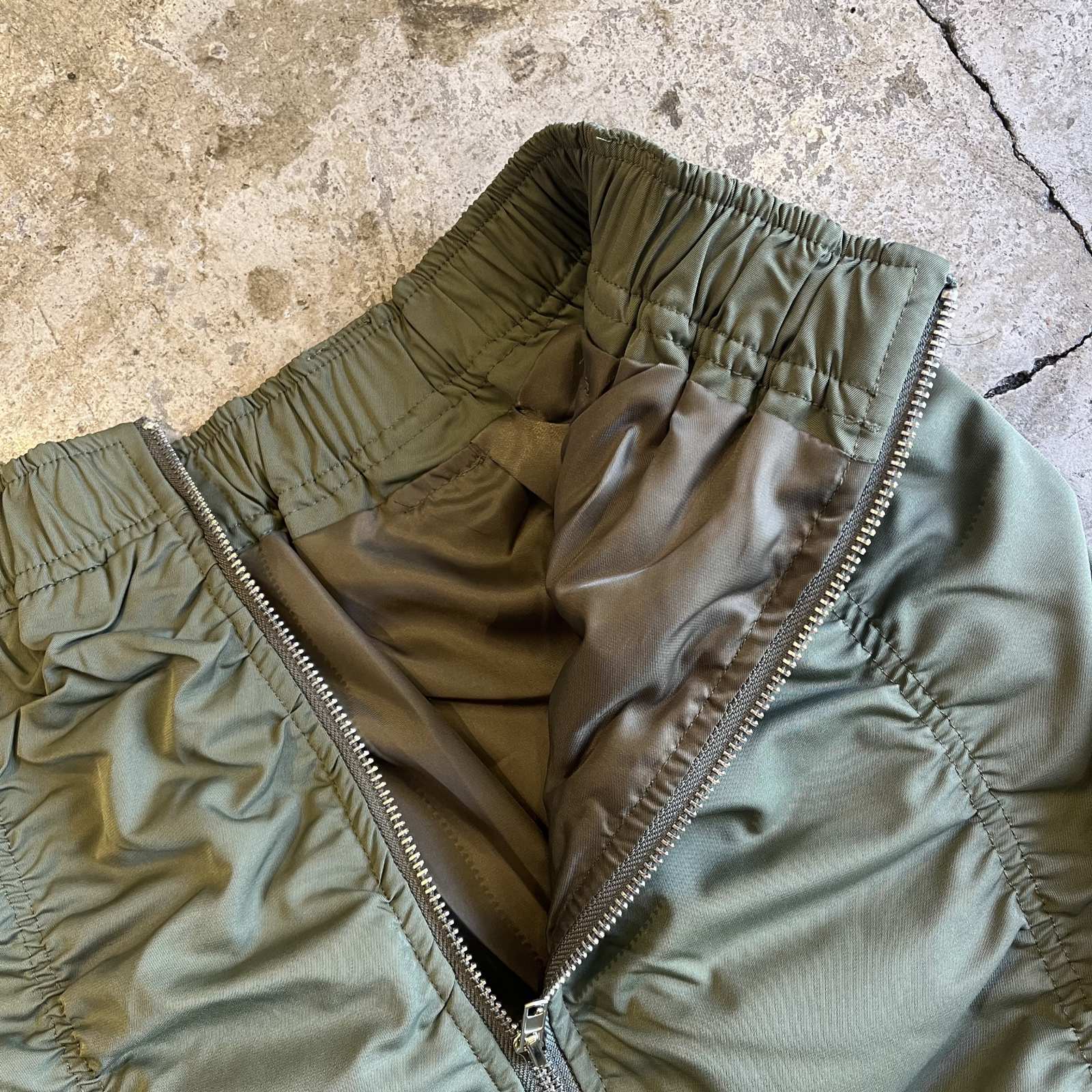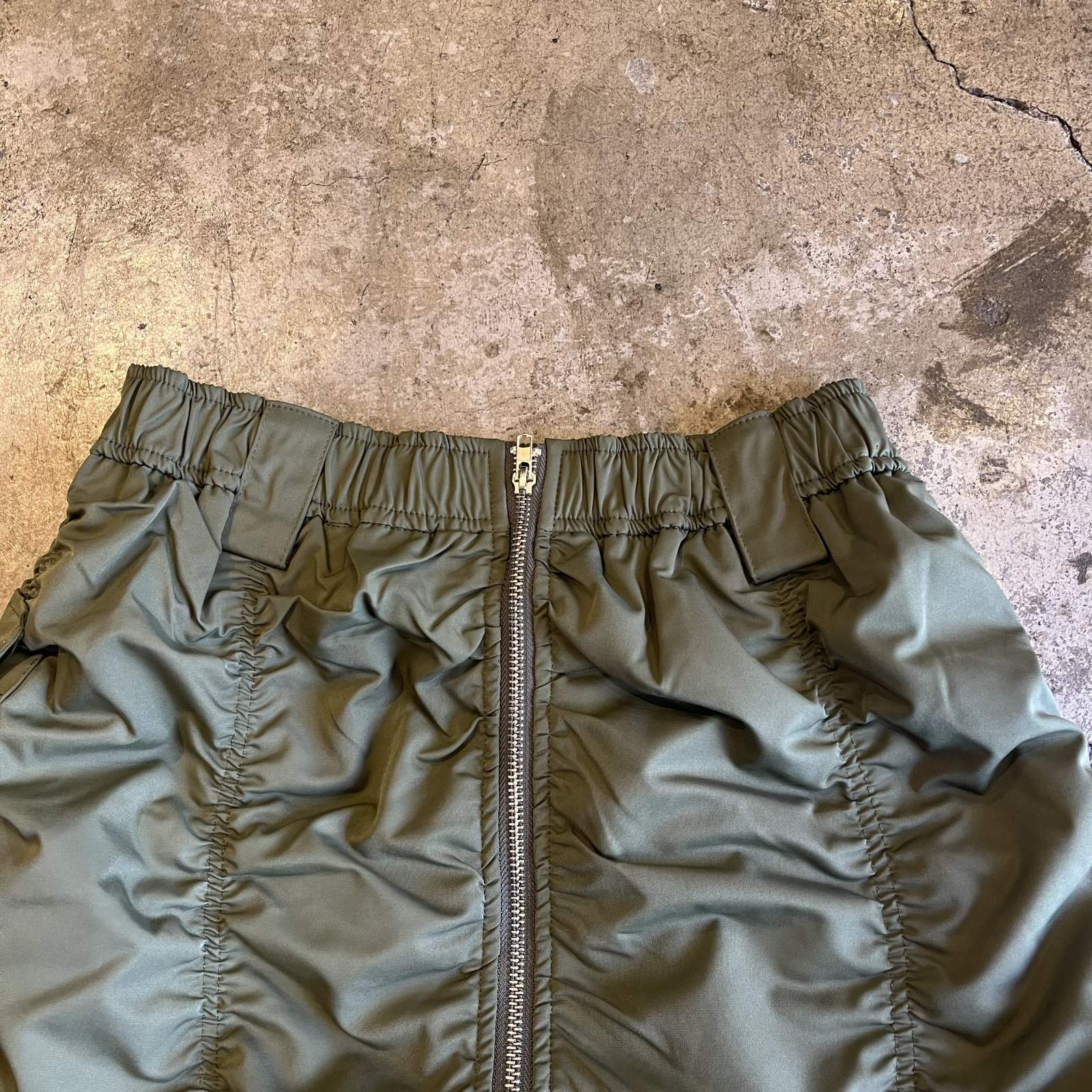 FRONT ZIP UP GATHER DESIGN NYLON LONG SKIRT / W25~W34