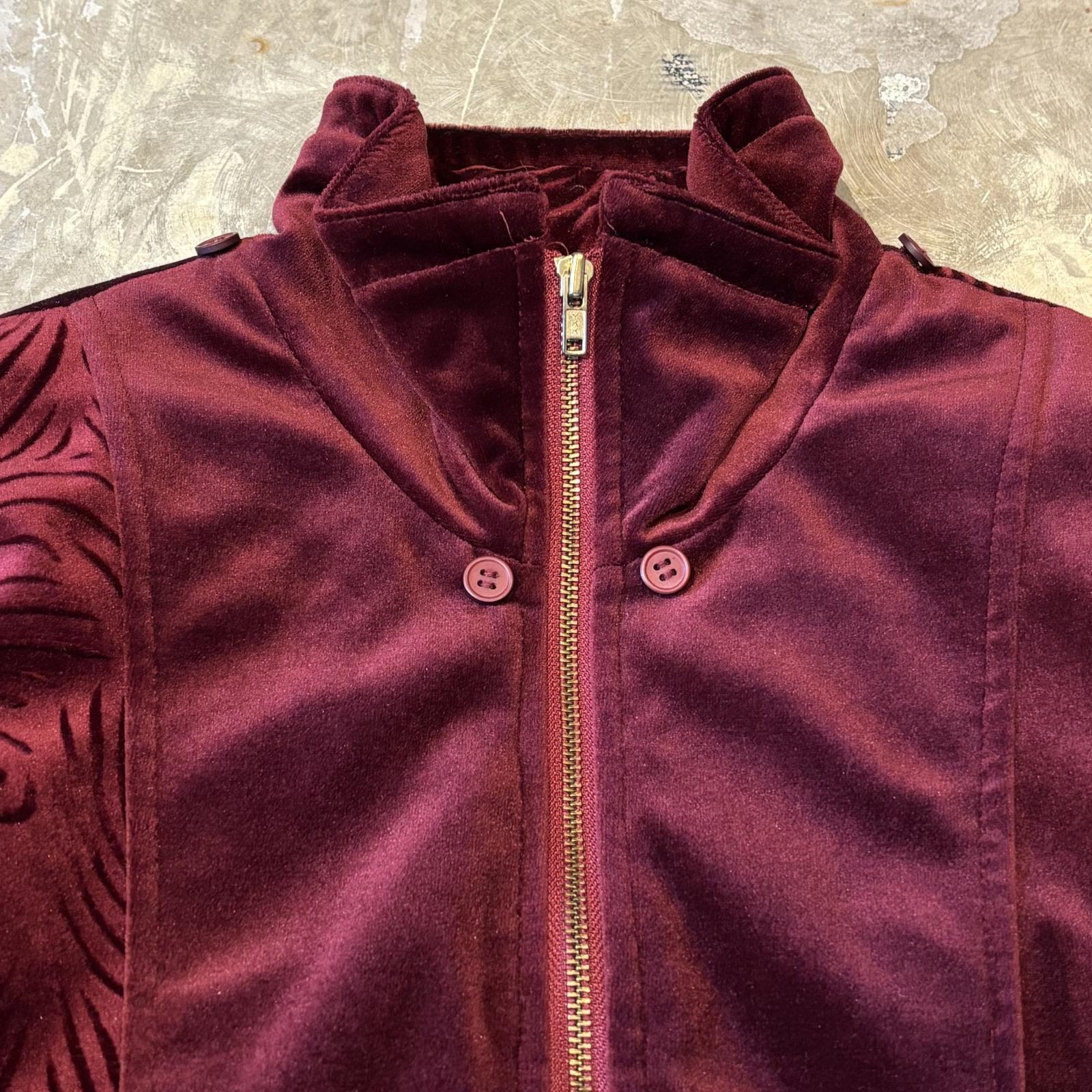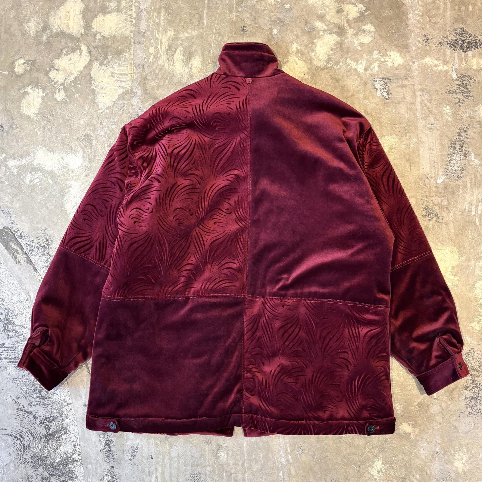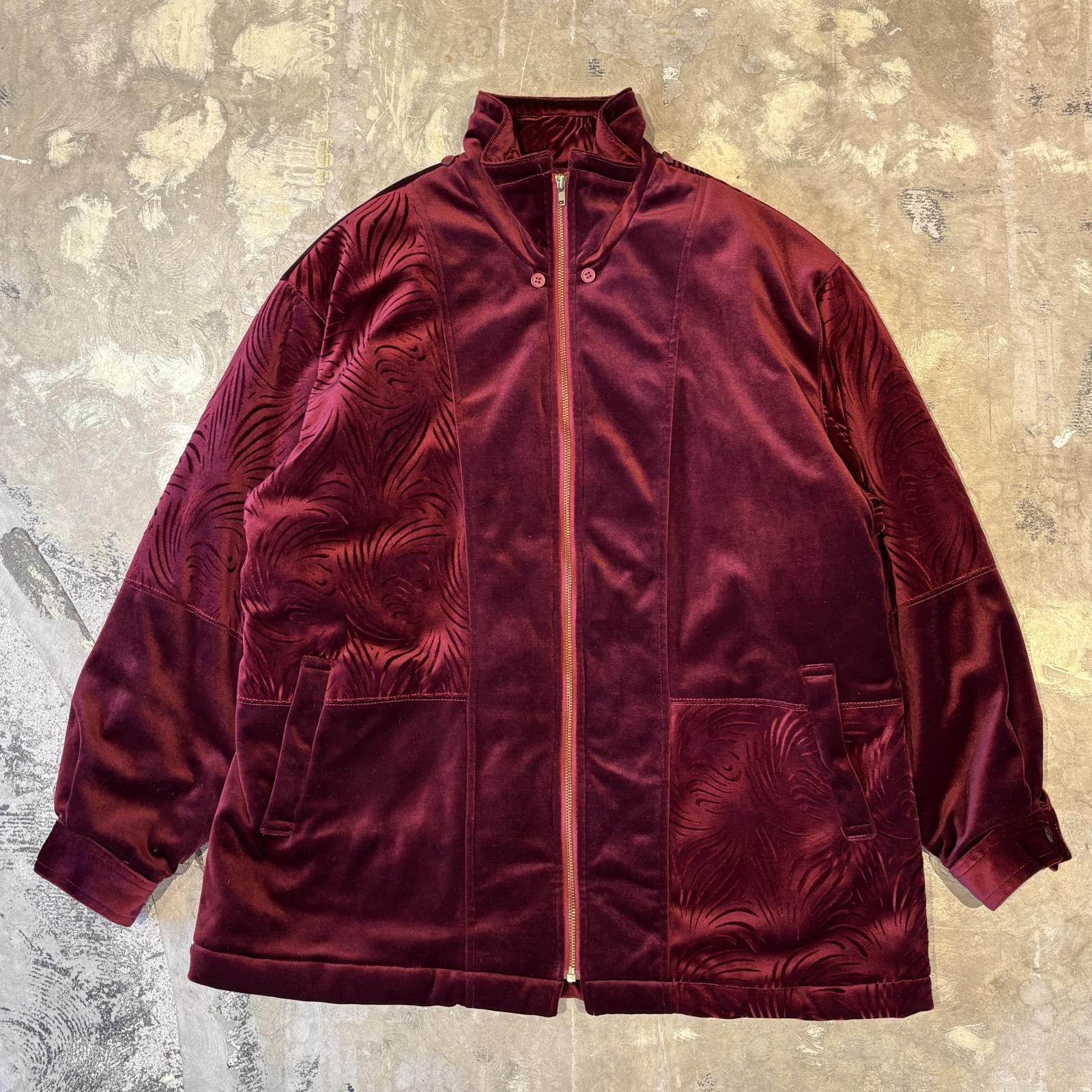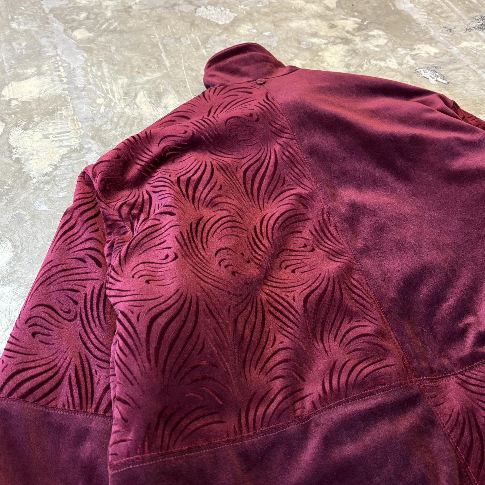 千鳥格子のような模様とボタニカル模様が重ねられた、抜群の存在感を放つデザインジャケット。 ベロア生地らしい光沢とワインレッドのようなカラーリングが妖艶さを醸し出す1枚。 厚手すぎない生地感に加えハ…