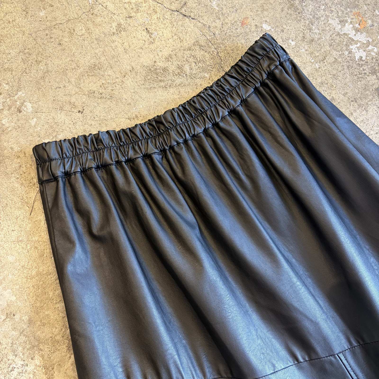 BLACK COLOR FAUX LEATHER FLARE DESIGN SKIRT / W24~W35