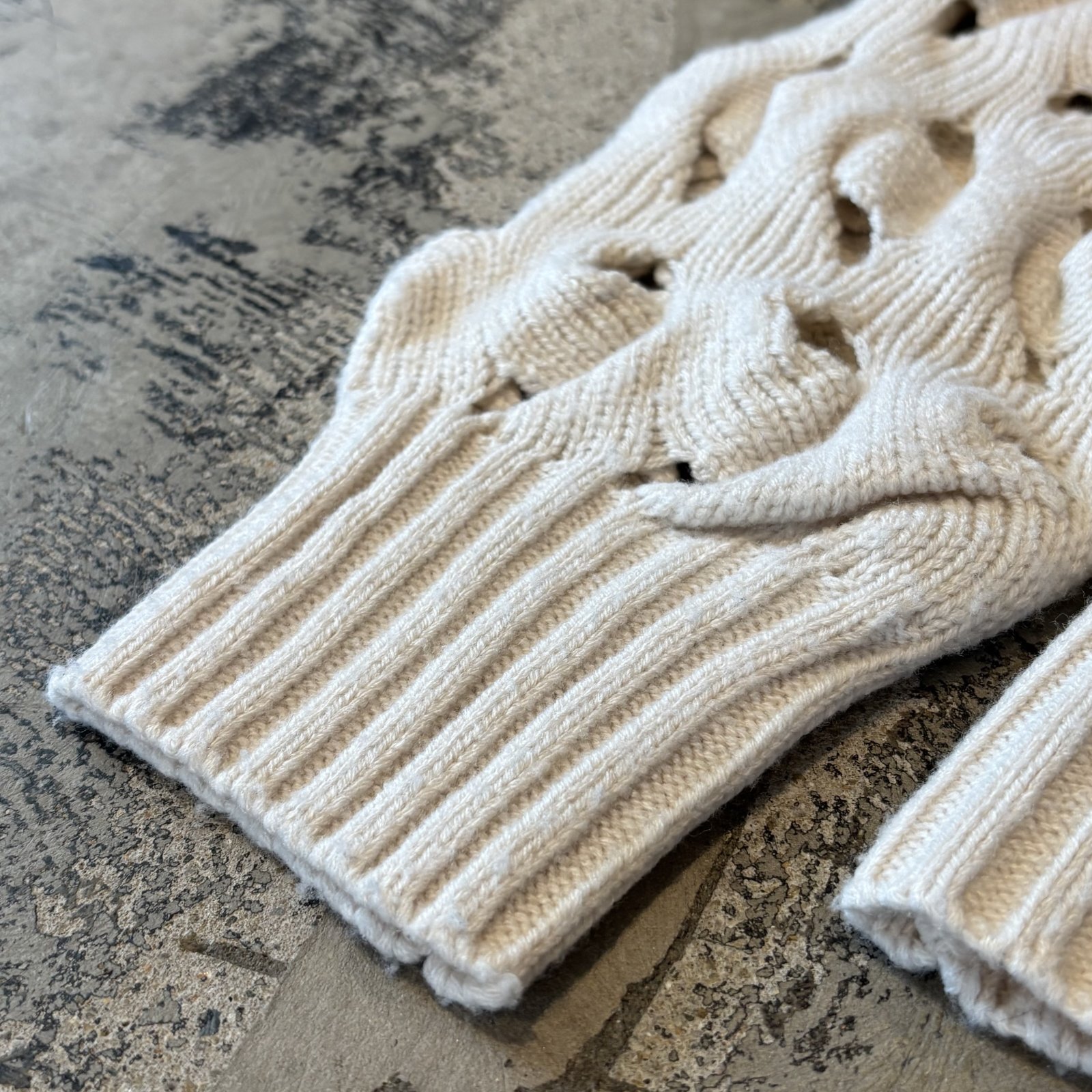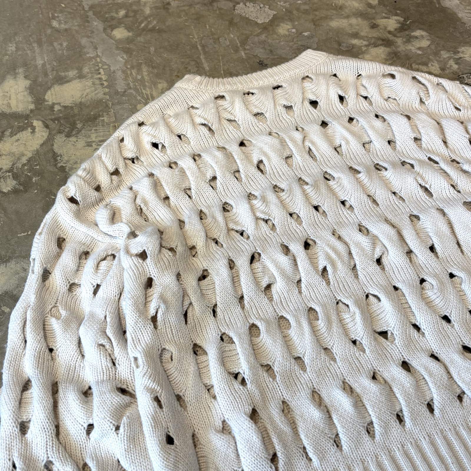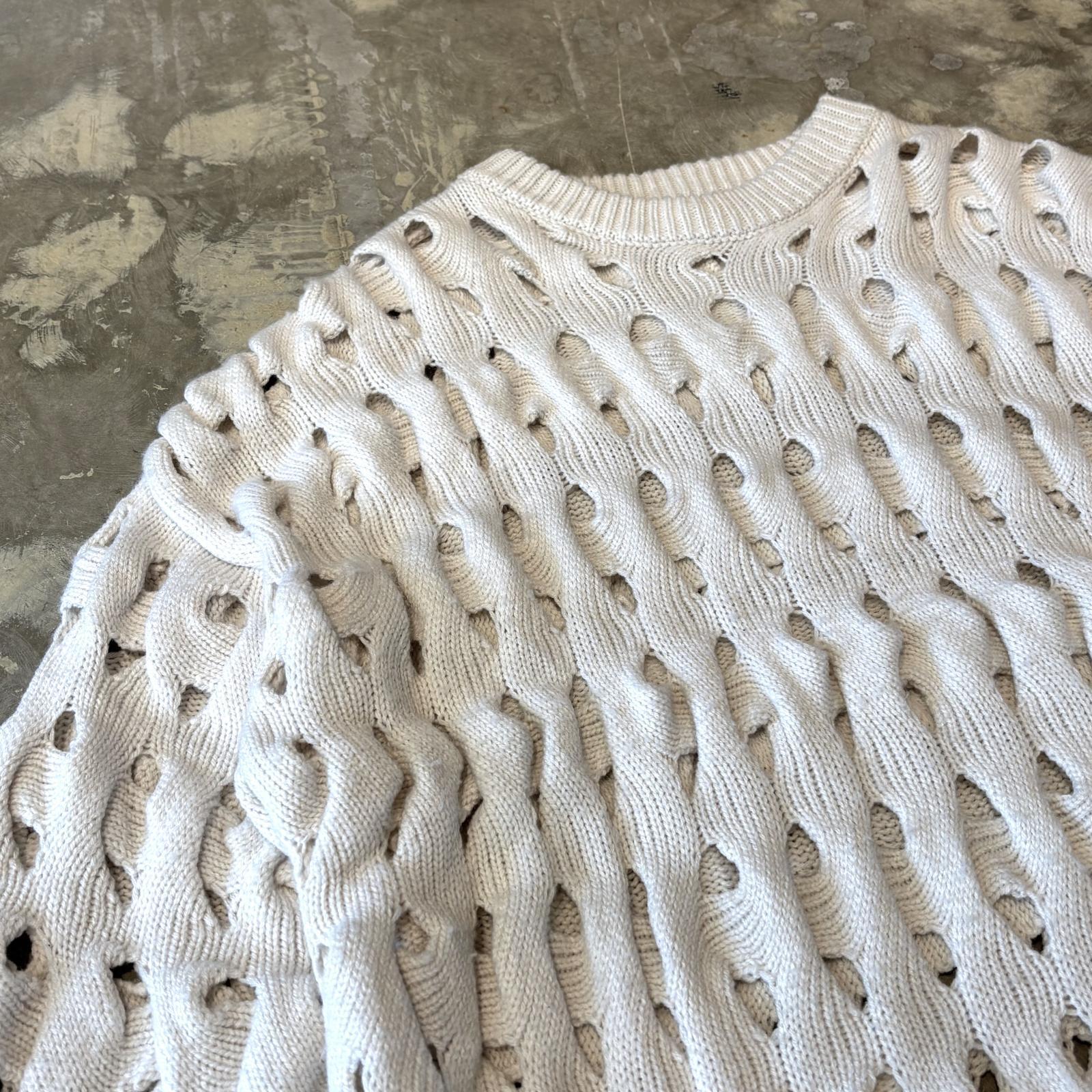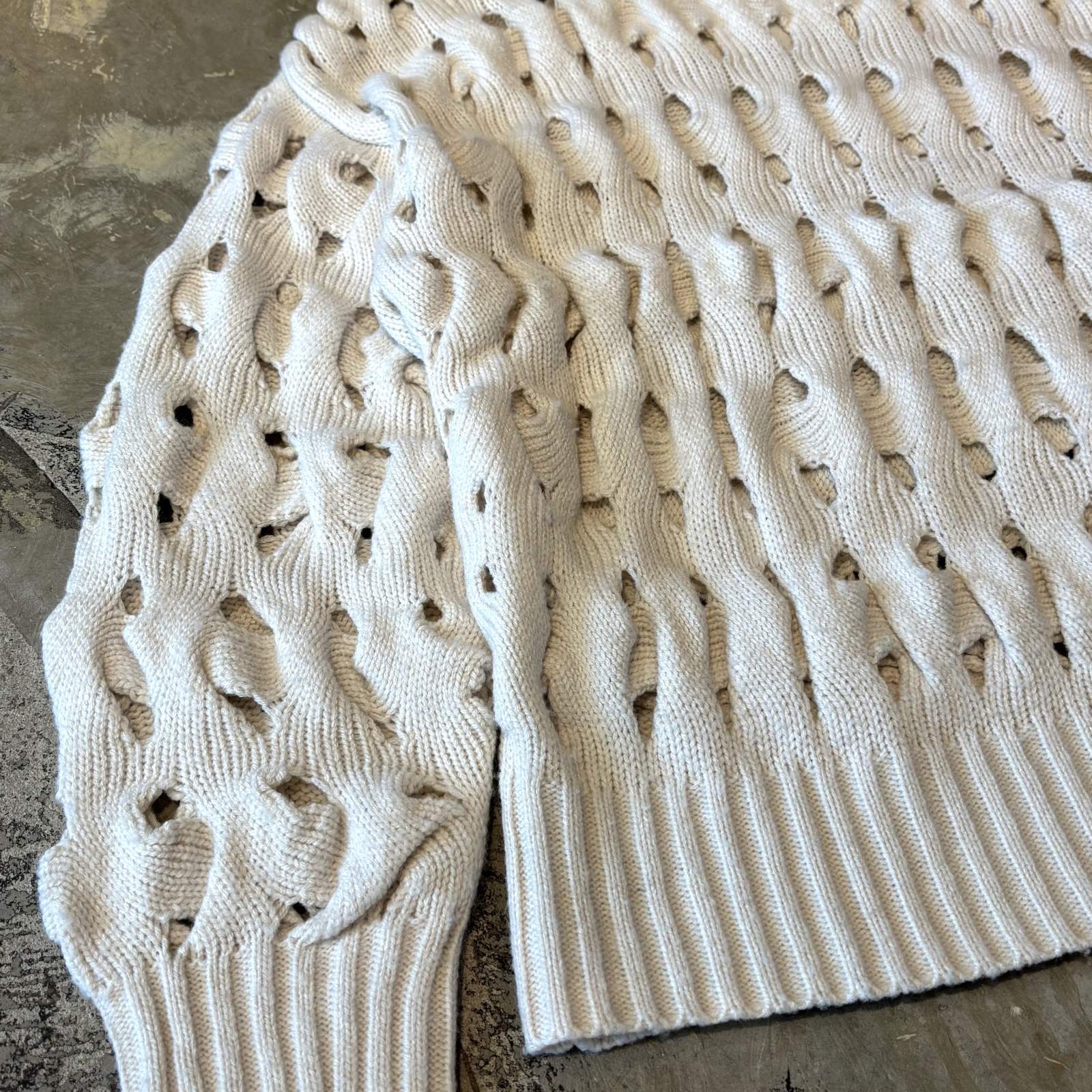 クラッシュダメージが唯一無二の存在感を放つ、デザインニットセーター。 シンプルなデザインを、ダメージが一味違うアイテムへと昇華させる1枚。 裾のジャンクな雰囲気はアートな印象すらも与えるディテール…