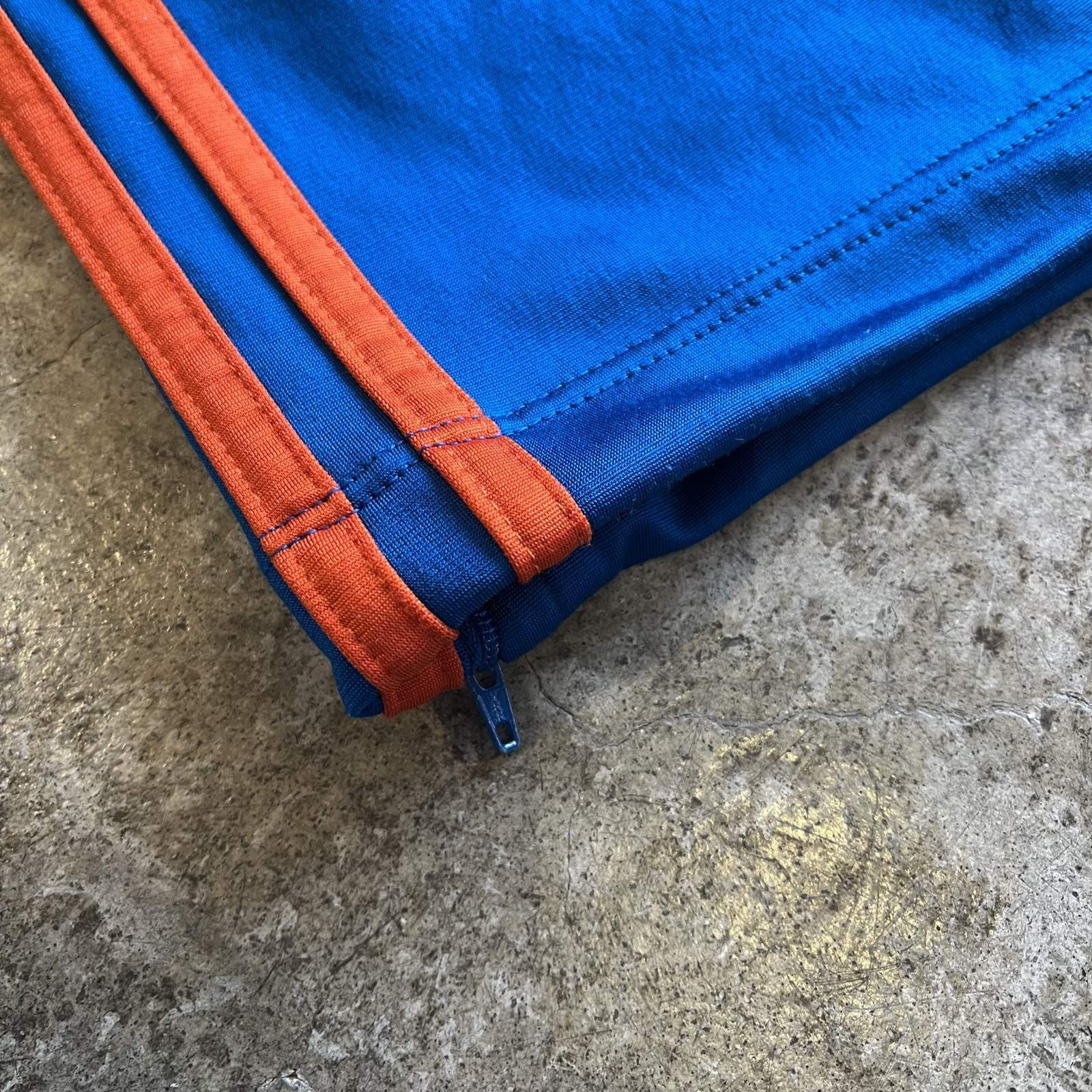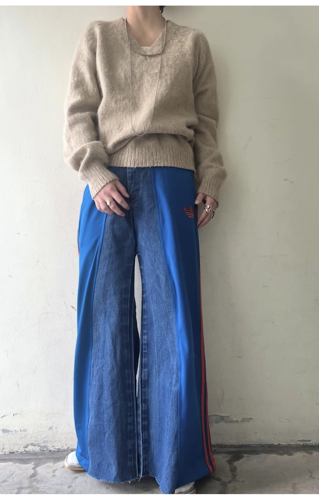 adidasのトラックパンツとデニムパンツをドッキングした1本。