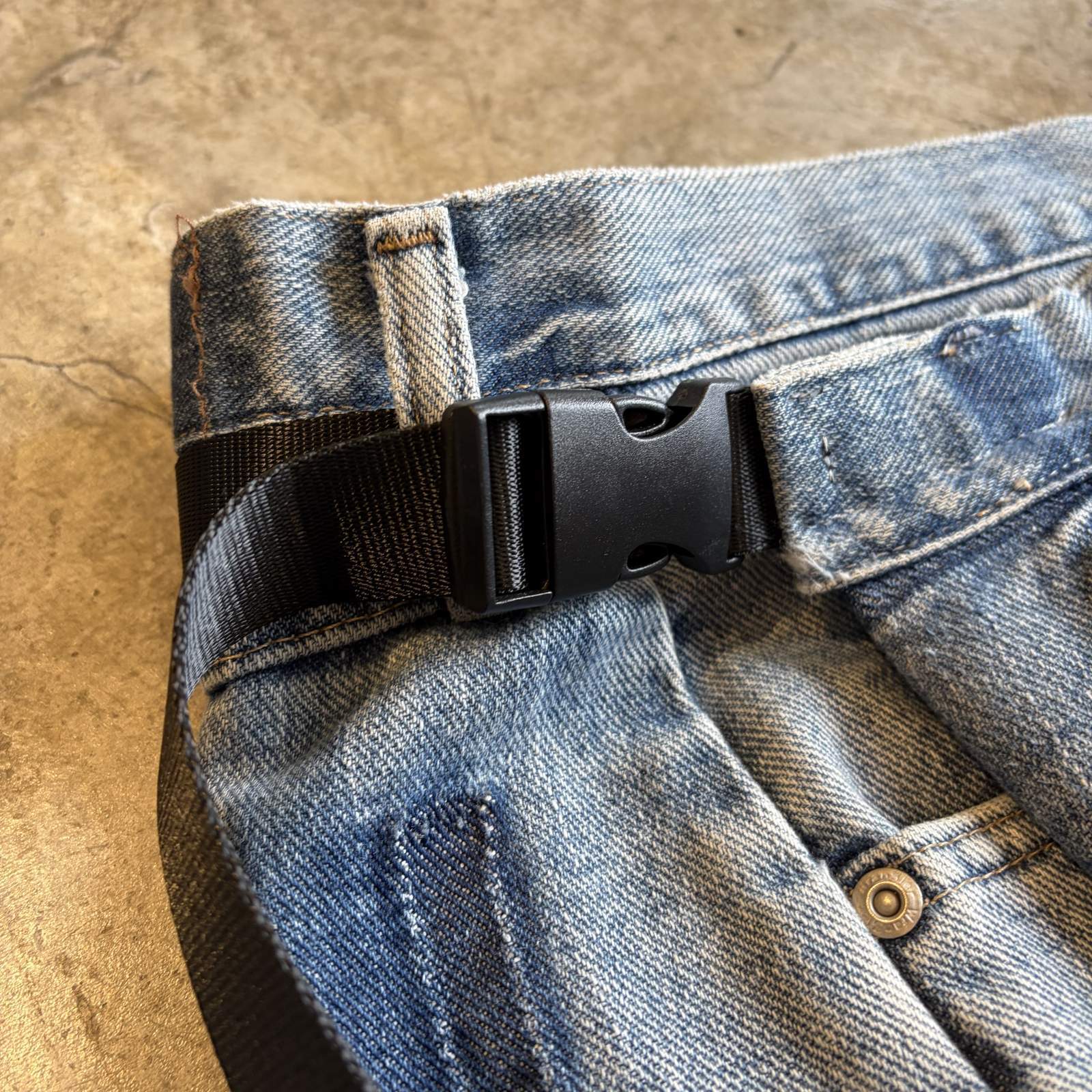 ウエストのサイズはボタンが3段階あり、ベルト調節も可能でW26~W30ほど対応可能なFREEサイズです。