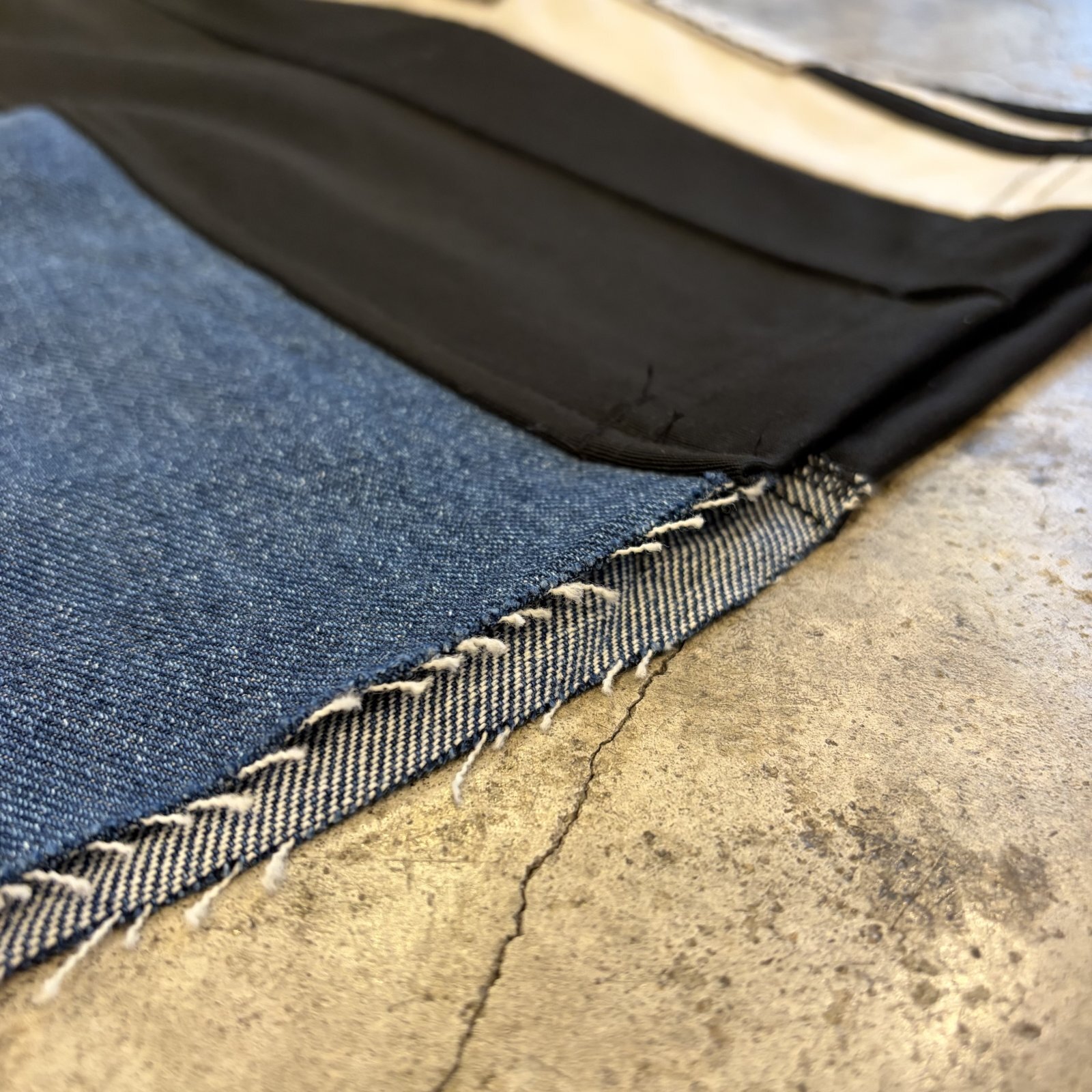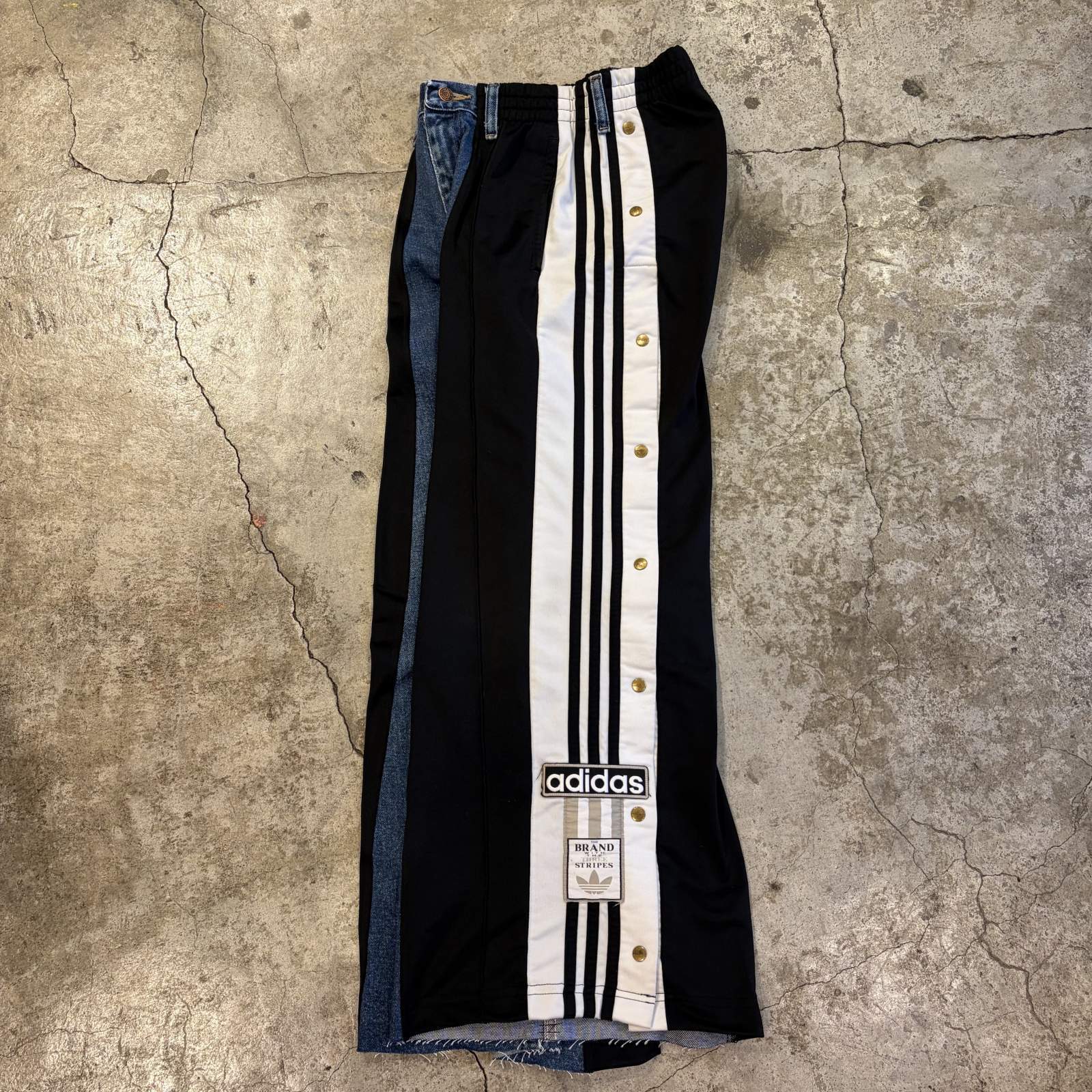 "adidas"のトラックパンツとデニムパンツをドッキングした1本。
