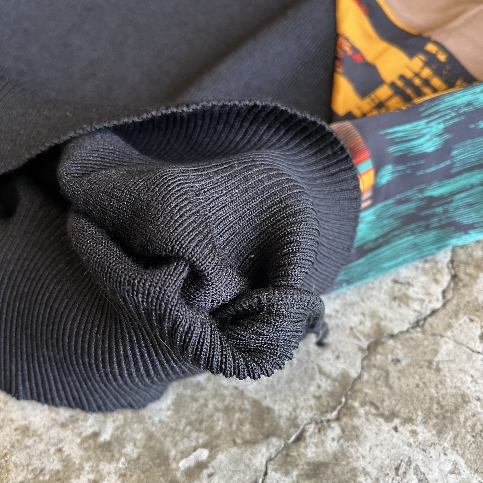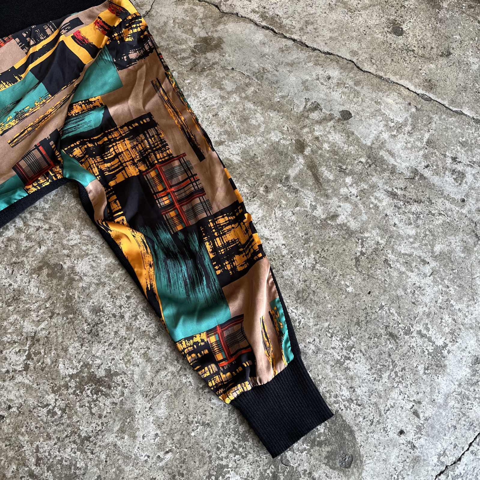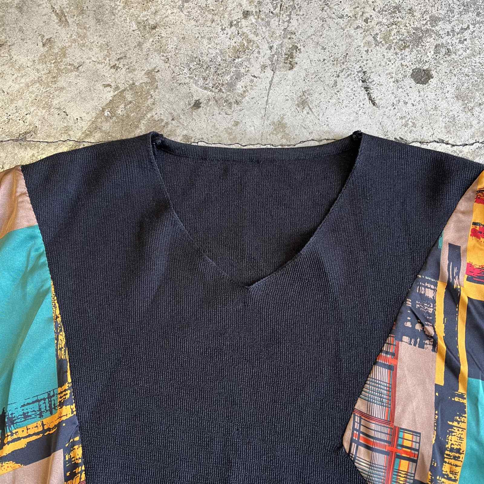 ブラックカラーベースのボディにアート模様の生地が切り返しで施された魅力的な1枚。