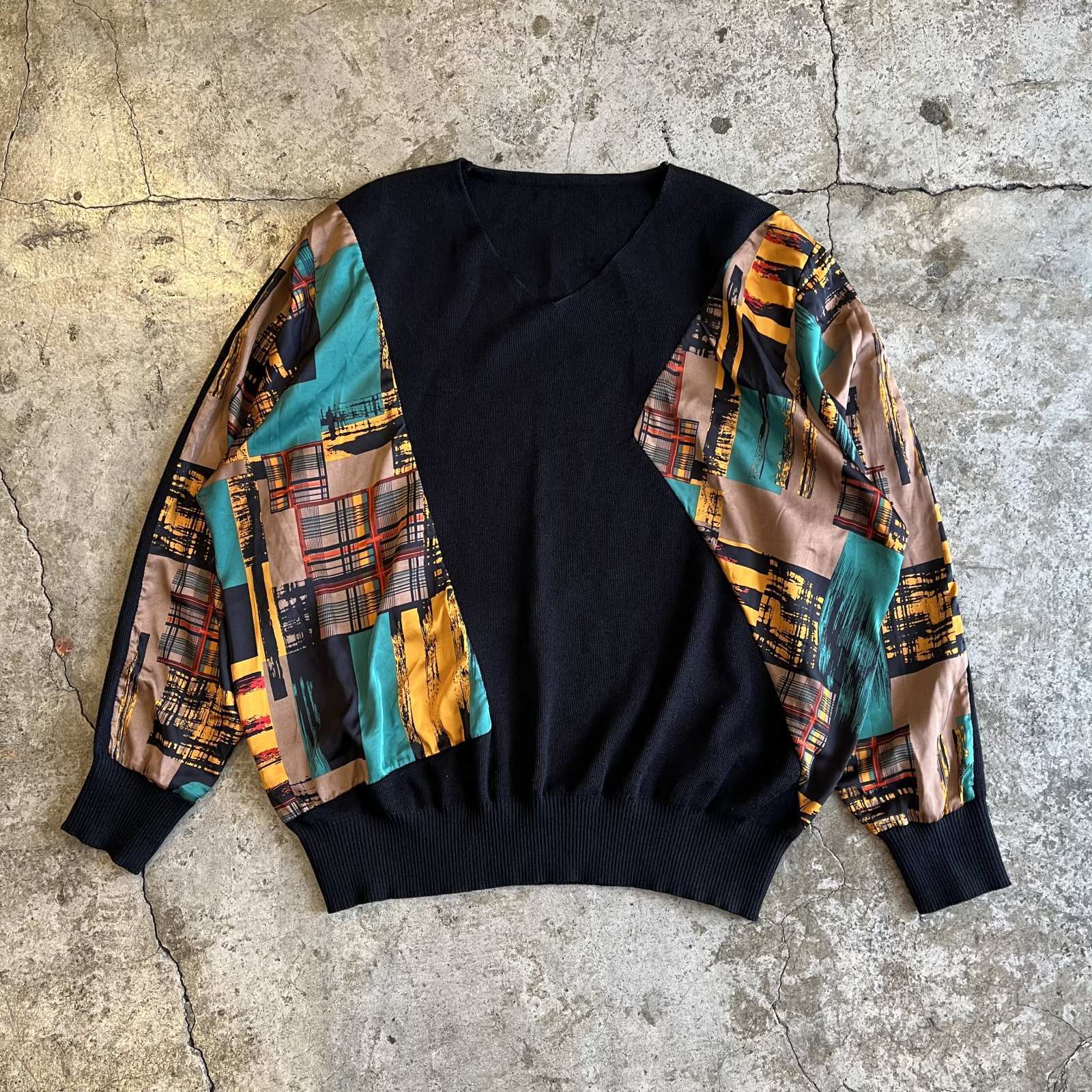 COLOR ART PATTERN PANELLED DESIGN KNIT L/S TOPS / Ladies M