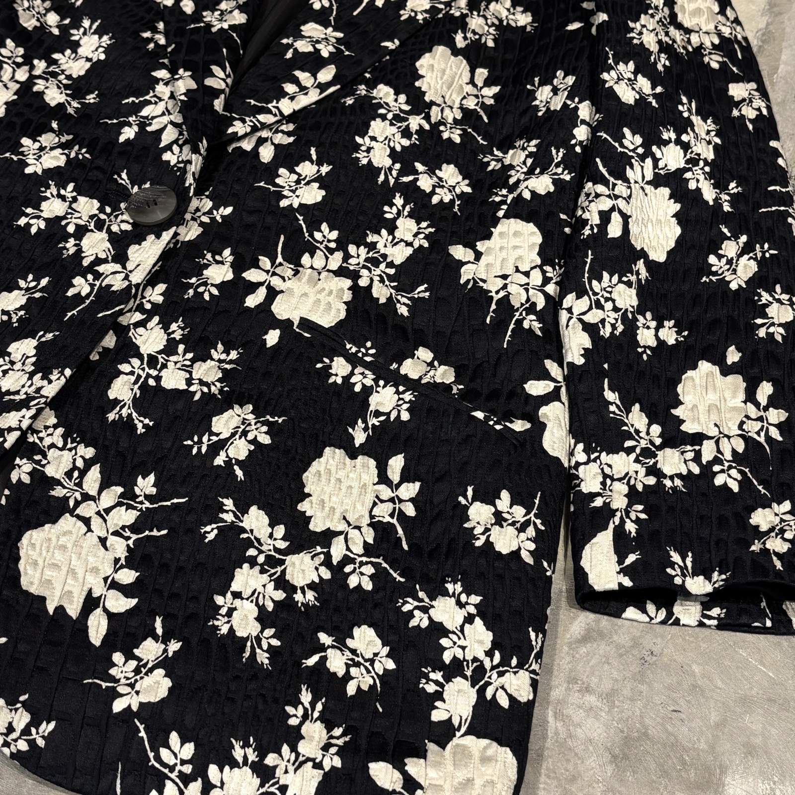 全体にラメ混じりの糸によるボタニカル模様が施された、デザインジャケット。 総柄ではあるものの刺繍らしい模様やラメの光沢が上品さを演出する1枚。 フロントオープン仕様でさらりと羽織りやすい点も魅力。…
