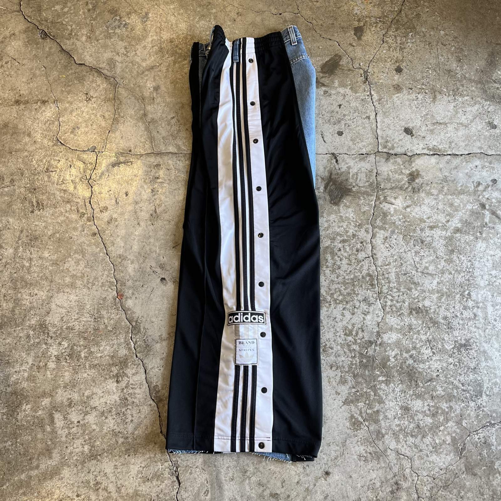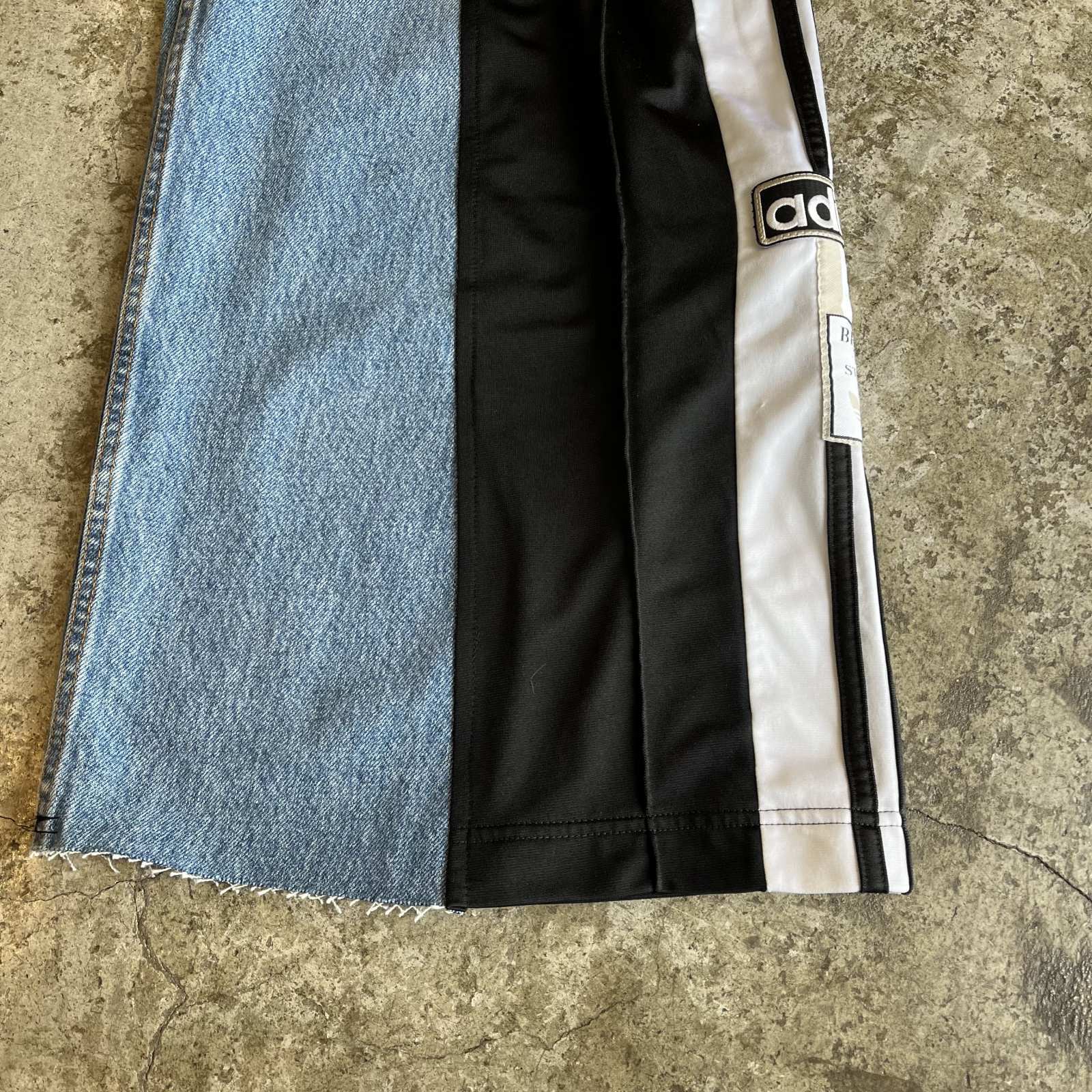 "adidas"のトラックパンツとデニムパンツをドッキングした1本。
